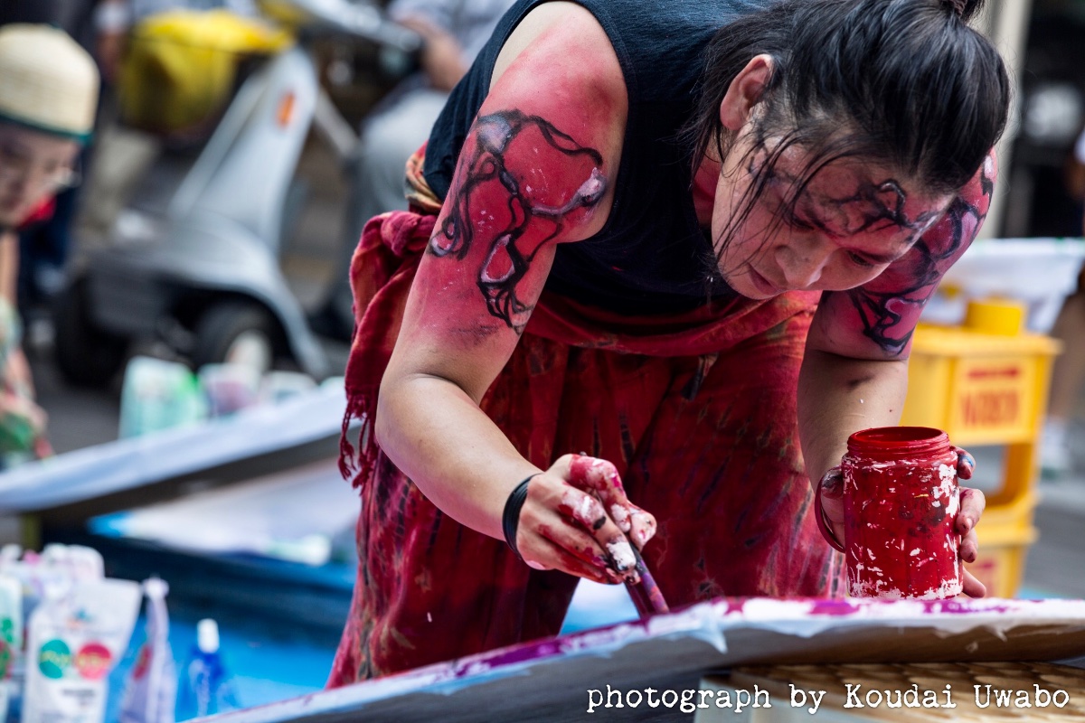 筆を持ちながら踊り狂うスタイルでの即興ライブアートを展開。