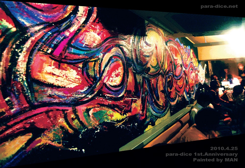 大阪・天神筋橋商店街にあるライブハウス。2010年4月、para-dice1周年イベントにおいてMANがライブイベント中に即興で制作しそのまま店のシンボルとなる。HP→扇町para-dice