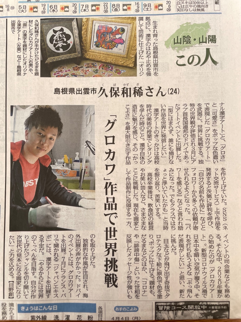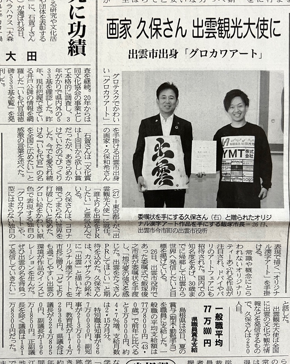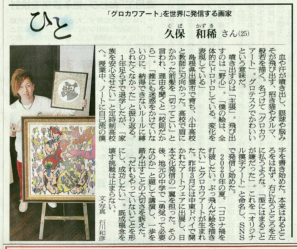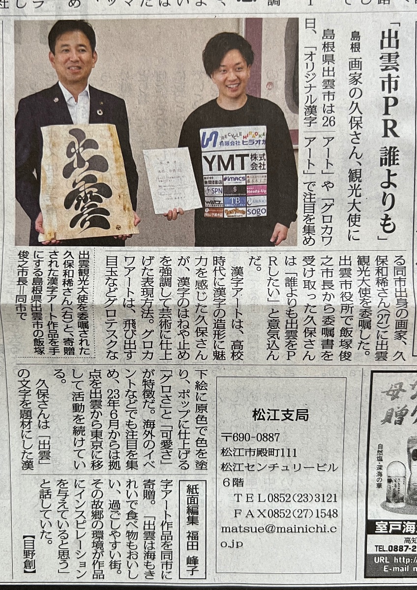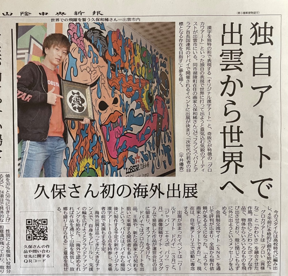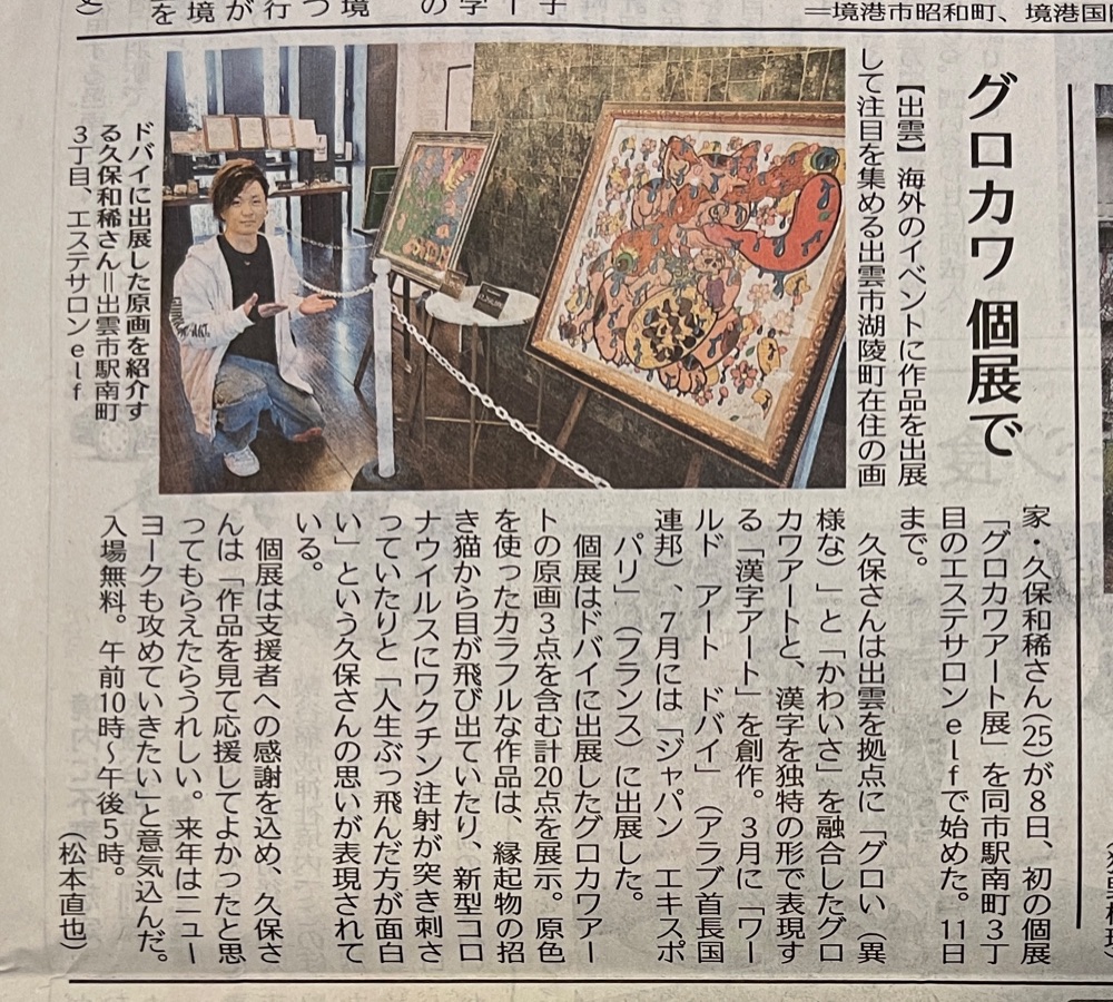 島根県出雲市出身 活動拠点:島根 / 大阪 / 東京 1997年生まれ / 3児の父 芸術年鑑「バイヤーズガイド2025」巻頭掲載 1号単価(評価額) : 151,800円(税込) TV・ラジオ出演 : 30回以上 国際放送 : 約160カ国 新聞掲載 : 20回以上 全国紙掲載 : 約400万部 【出展】 🇫🇷Japan Expo Paris 2022 🇦🇪World Art Dubai 2022 🇺🇸Aqua Art Miami 2024 🇯🇵東京都美術館 極美本展 【コラボレーション】 令和の虎 Repezen Foxx GEMCEREY eプリントサービス 出雲神話まつり 浅尾繊維工業 伝藝一茶×大幸園 LOCAL-IZM INKBOX 一宮酒造 タナベ刺繍 B.O.T しるし株式会社 とめきち H.M.C GEEK JAM Dazzling シマネジェットフェス 【TV・YouTube】 TSK「かまいたちの掟」 BSS「生たまごBang!」 NHK WORLD「国際放送」 NHK「しまねっとNEWS610」 TSK「Live News イット!」 BSS「テレポート山陰」 TSK「ヤッホー!」 マーブル「まるまる松江」 出雲ケーブル「いずもキャッチアイ」 YouTube「令和の虎」SNS版 【ラジオ】 渋谷クロスFM「SHIBUYA-base Radio」 渋谷クロスFM「VOICE」 DARAZ FM「腹よしおの耳を食べる」 エフエム山陰「SAN-IN MUSIC FILE」 エフエム山陰「Be Lucky!」 DARAZ FM「こうやってこうするフライデー」 エフエムいずも「WEEK縁どようび♪」 MUSIC BIRD「まだ水曜⁈」 SKY WAVE FM「治面地順子のYour Dreaming」 RainbowtownFM「ミサトーナイト!!」 【新聞】 山陰中央新報(5回) 毎日新聞(5回) 島根日日新聞(4回) 朝日新聞(3回) 読売新聞(1回) 情報紙あえる(2回) 累計20回以上掲載 ※順不同・敬称略 ⎯⎯⎯⎯⎯⎯⎯⎯⎯⎯⎯⎯⎯⎯⎯⎯⎯ 【プロフィール】 島根県出雲市出身の画家。出雲観光大使。2022年、ドバイとパリのアートフェアに招待出展。企業・著名人とのコラボレーションやメディアでの紹介を重ね、活動の幅を広げてきた。表現の核は、独自スタイル「グロカワアート®︎」。国際的な芸術年鑑「バイヤーズガイド2025」に巻頭で紹介され、20代での掲載は異例として注目を集めた。27歳で作品評価額が定められ、国内外への展開を加速させている。 ⎯⎯⎯⎯⎯⎯⎯⎯⎯⎯⎯⎯⎯⎯⎯⎯⎯ 【グロカワアート®︎】 グロテスクとカワイイを融合した独自の表現。アクリル絵の具を主素材に、鮮烈な色面と黒の輪郭線で構成し、異様さとポップが交差する世界を描く。コンセプトは「綺麗事は非現実」。歪んだ線は現実を描き、体液は自己主張として溢れ、突出には野心、溶解は変化を示し、抽象は本質を映し、七色には七福を込め、金彩を重ねた八色には御縁と末広がり、無限を宿す。常識に飽きた衝動を細部まで刻み込む。 ⎯⎯⎯⎯⎯⎯⎯⎯⎯⎯⎯⎯⎯⎯⎯⎯⎯ 【オリジナル漢字アート】 漢字の形に固定された常識を一度解き、画の運び、重心や余白を組み替えて再構成する独自の表現。アクリル絵の具を主素材に、形を作り、黒を置き、際で完成させる。書でもデザインでもない、「型に収まらない意思」を一画一画に刻み込む。 ⎯⎯⎯⎯⎯⎯⎯⎯⎯⎯⎯⎯⎯⎯⎯⎯⎯ 【ご依頼】※税込表記 ◾️グロカワアート®︎ 《抽象画》 1号 : 151,800円 《具象画》 A4 : 330,000円 データ譲渡 : +110,000円 ◾️オリジナル漢字アート 《A4サイズ》 1文字 : 110,000円 2文字以上 : 165,000円 データ譲渡 : +110,000円 ◾️内装壁画(全国出張) 55,000円〜 ※別途交通費/宿泊費