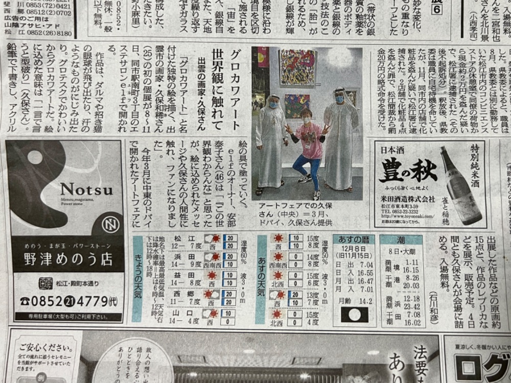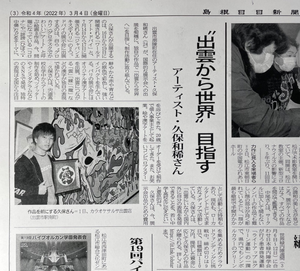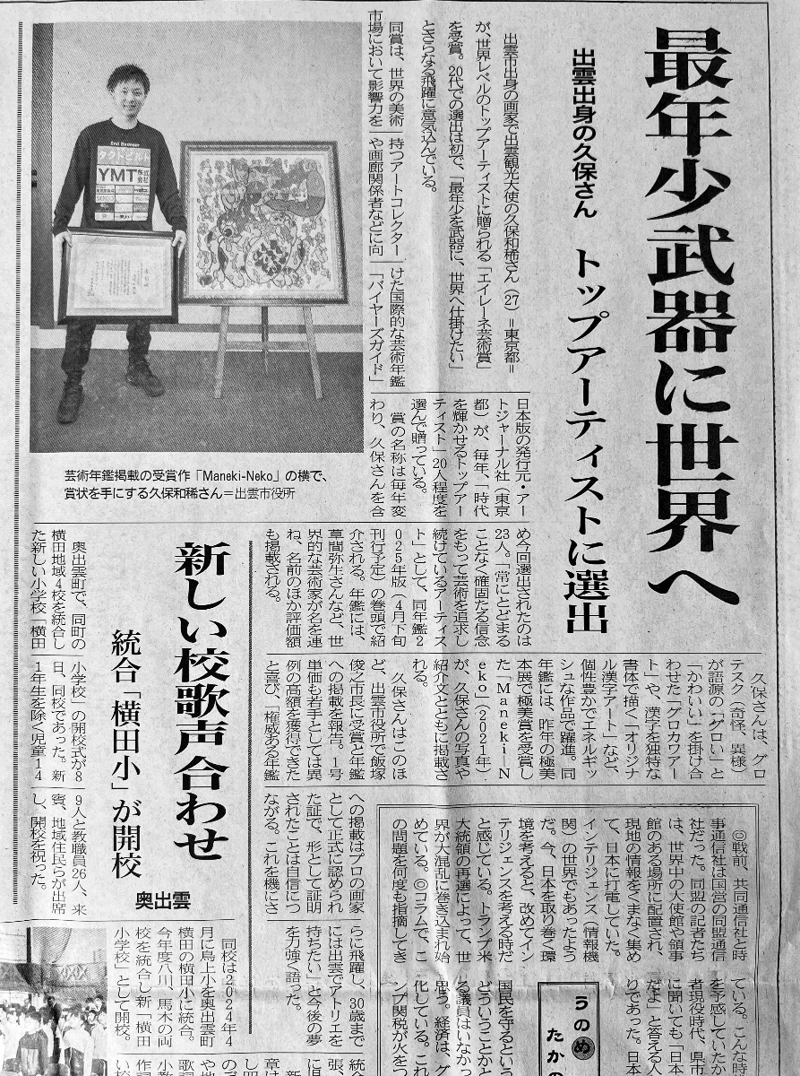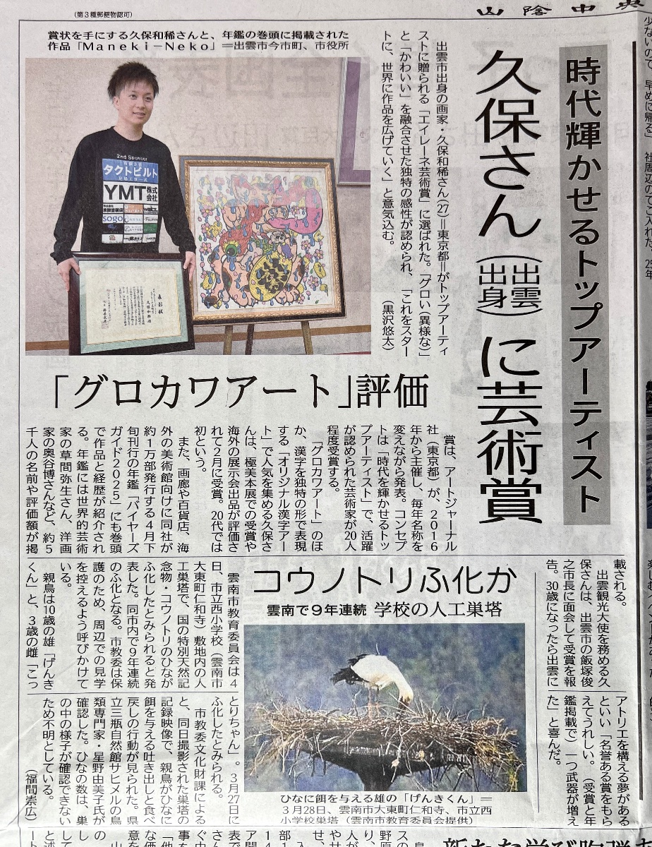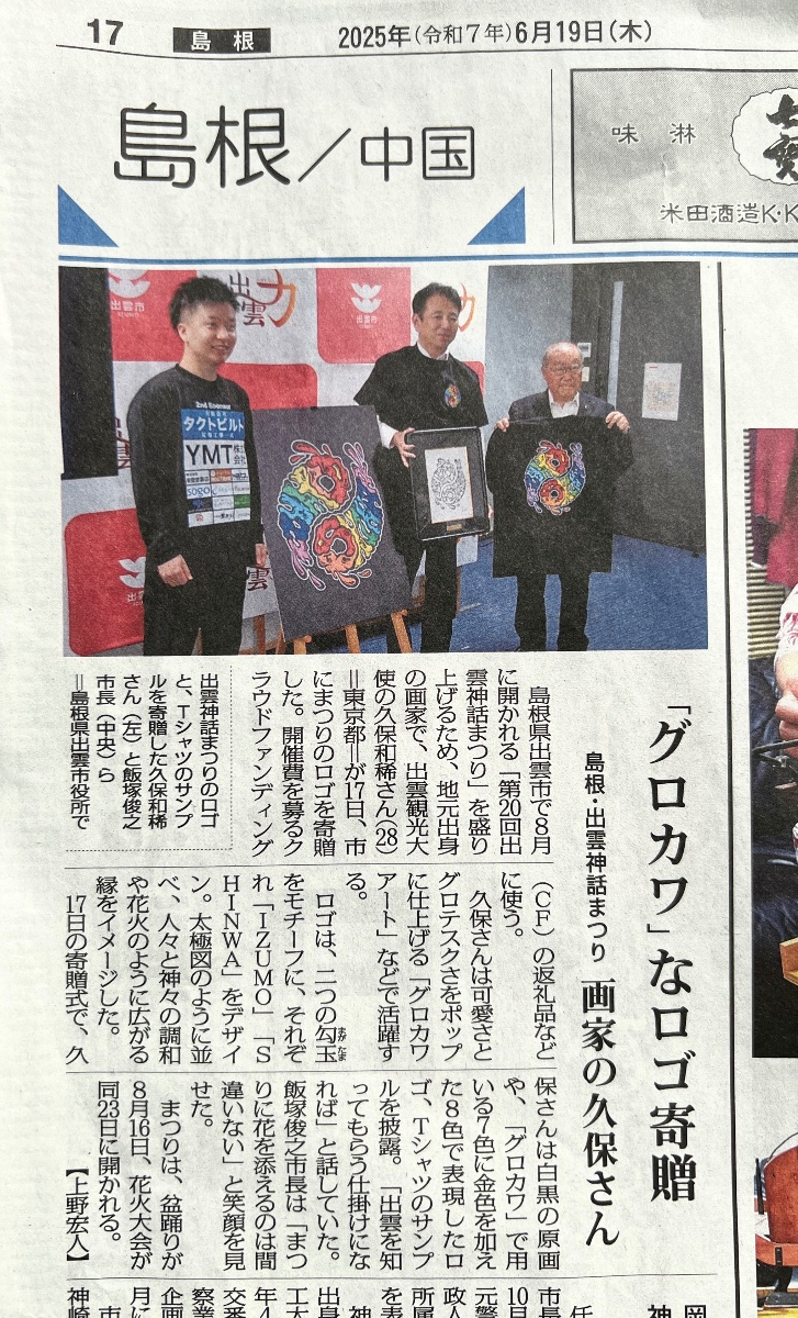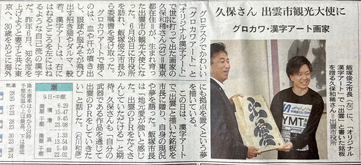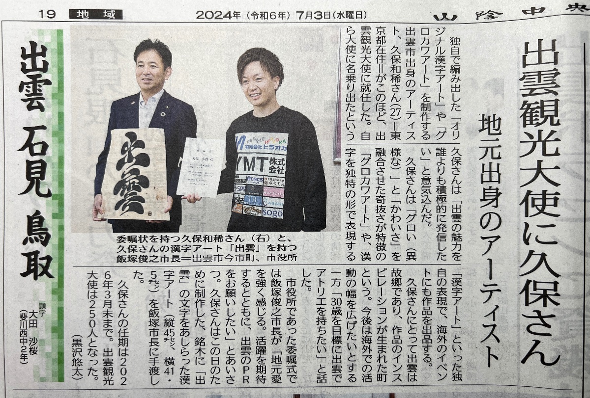 島根県出雲市出身 活動拠点:島根 / 大阪 / 東京 1997年生まれ / 3児の父 芸術年鑑「バイヤーズガイド2025」巻頭掲載 1号単価(評価額) : 151,800円(税込) TV・ラジオ出演 : 30回以上 国際放送 : 約160カ国 新聞掲載 : 20回以上 全国紙掲載 : 約400万部 【出展】 🇫🇷Japan Expo Paris 2022 🇦🇪World Art Dubai 2022 🇺🇸Aqua Art Miami 2024 🇯🇵東京都美術館 極美本展 【コラボレーション】 令和の虎 Repezen Foxx GEMCEREY eプリントサービス 出雲神話まつり 浅尾繊維工業 伝藝一茶×大幸園 LOCAL-IZM INKBOX 一宮酒造 タナベ刺繍 B.O.T しるし株式会社 とめきち H.M.C GEEK JAM Dazzling シマネジェットフェス 【TV・YouTube】 TSK「かまいたちの掟」 BSS「生たまごBang!」 NHK WORLD「国際放送」 NHK「しまねっとNEWS610」 TSK「Live News イット!」 BSS「テレポート山陰」 TSK「ヤッホー!」 マーブル「まるまる松江」 出雲ケーブル「いずもキャッチアイ」 YouTube「令和の虎」SNS版 【ラジオ】 渋谷クロスFM「SHIBUYA-base Radio」 渋谷クロスFM「VOICE」 DARAZ FM「腹よしおの耳を食べる」 エフエム山陰「SAN-IN MUSIC FILE」 エフエム山陰「Be Lucky!」 DARAZ FM「こうやってこうするフライデー」 エフエムいずも「WEEK縁どようび♪」 MUSIC BIRD「まだ水曜⁈」 SKY WAVE FM「治面地順子のYour Dreaming」 RainbowtownFM「ミサトーナイト!!」 【新聞】 山陰中央新報(5回) 毎日新聞(5回) 島根日日新聞(4回) 朝日新聞(3回) 読売新聞(1回) 情報紙あえる(2回) 累計20回以上掲載 ※順不同・敬称略 ⎯⎯⎯⎯⎯⎯⎯⎯⎯⎯⎯⎯⎯⎯⎯⎯⎯ 【プロフィール】 島根県出雲市出身の画家。出雲観光大使。2022年、ドバイとパリのアートフェアに招待出展。企業・著名人とのコラボレーションやメディアでの紹介を重ね、活動の幅を広げてきた。表現の核は、独自スタイル「グロカワアート®︎」。国際的な芸術年鑑「バイヤーズガイド2025」に巻頭で紹介され、20代での掲載は異例として注目を集めた。27歳で作品評価額が定められ、国内外への展開を加速させている。 ⎯⎯⎯⎯⎯⎯⎯⎯⎯⎯⎯⎯⎯⎯⎯⎯⎯ 【グロカワアート®︎】 グロテスクとカワイイを融合した独自の表現。アクリル絵の具を主素材に、鮮烈な色面と黒の輪郭線で構成し、異様さとポップが交差する世界を描く。コンセプトは「綺麗事は非現実」。歪んだ線は現実を描き、体液は自己主張として溢れ、突出には野心、溶解は変化を示し、抽象は本質を映し、七色には七福を込め、金彩を重ねた八色には御縁と末広がり、無限を宿す。常識に飽きた衝動を細部まで刻み込む。 ⎯⎯⎯⎯⎯⎯⎯⎯⎯⎯⎯⎯⎯⎯⎯⎯⎯ 【オリジナル漢字アート】 漢字の形に固定された常識を一度解き、画の運び、重心や余白を組み替えて再構成する独自の表現。アクリル絵の具を主素材に、形を作り、黒を置き、際で完成させる。書でもデザインでもない、「型に収まらない意思」を一画一画に刻み込む。 ⎯⎯⎯⎯⎯⎯⎯⎯⎯⎯⎯⎯⎯⎯⎯⎯⎯ 【ご依頼】※税込表記 ◾️グロカワアート®︎ 《抽象画》 1号 : 151,800円 《具象画》 A4 : 330,000円 データ譲渡 : +110,000円 ◾️オリジナル漢字アート 《A4サイズ》 1文字 : 110,000円 2文字以上 : 165,000円 データ譲渡 : +110,000円 ◾️内装壁画(全国出張) 55,000円〜 ※別途交通費/宿泊費