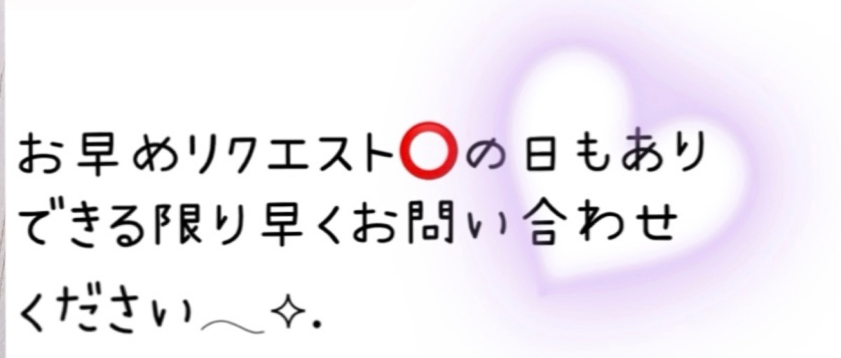 𖤐シフトの時間枠以外も対応可能な所(例えば 19時→26時のシフトの場合19時前や26時以降)があります。お問い合わせ下さい︎✌️𖤐予約状況を見てシフト変更するので 予約アプリを見てみて〇になっていればお問い合わせ無くても予約可能です𖤐何ヶ月先でもリクエスト可能です (突然の動かせない予定や体調不良もあるかもしれないのでキャンセル、変更可能)𖤐キャンセル待ちをしたい方、空き枠、シフトを毎回個人的に送ってほしい方はご連絡下さい✌️𖤐毎週○曜日、とか固定で予約も可能です(来れない所はもちろん振替、お休み⭕️)𖤐ご予約確定後、すぐに承認メールが届きます。必ず連絡の取れるアドレスをご記入ください(ご記入頂かないとお部屋の連絡が出来ません)注意事項⚠️