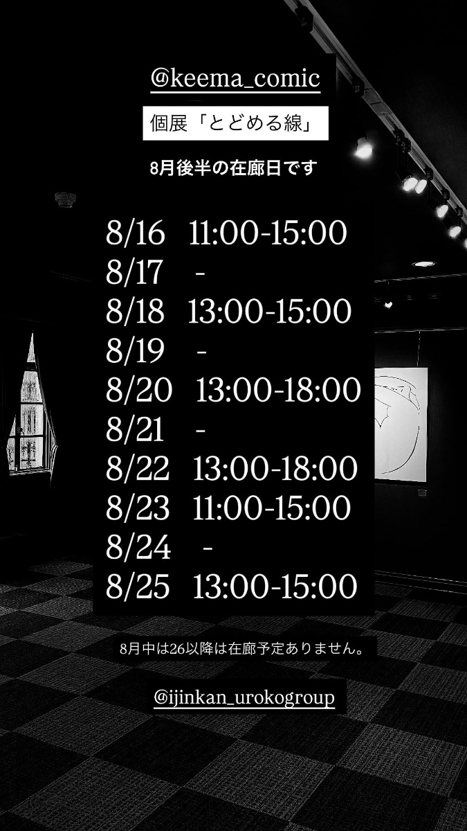 在廊予定 8/16 11:00-15:00 8/17 - 8/18 13:00-15:00 8/19 - 8/20 13:00-18:00 8/21 - 8/22 13:00-18:00 8/23 11:00-15:00 8/24 - 8/25 13:00-15:00