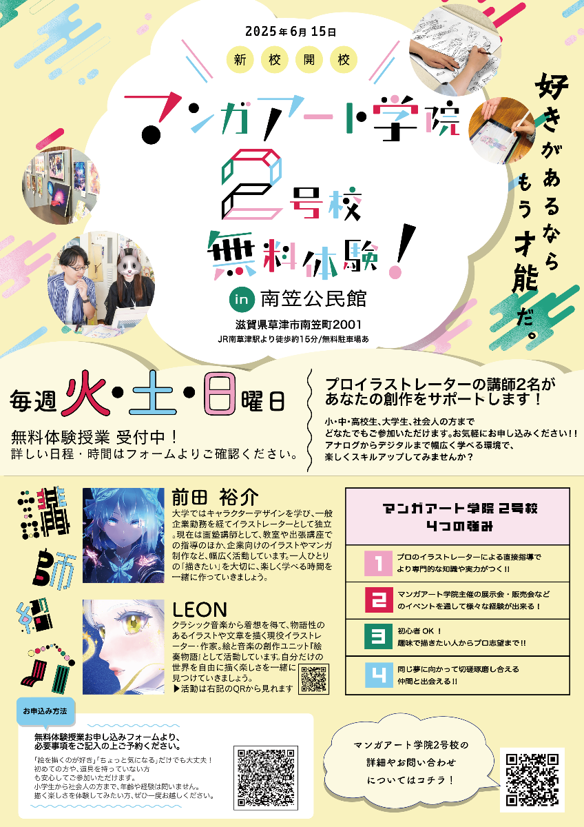 こちらは6/15(日)から開校したマンガアート学院 2号校の仮設ホームページです! 5月18日より入学受付開始!