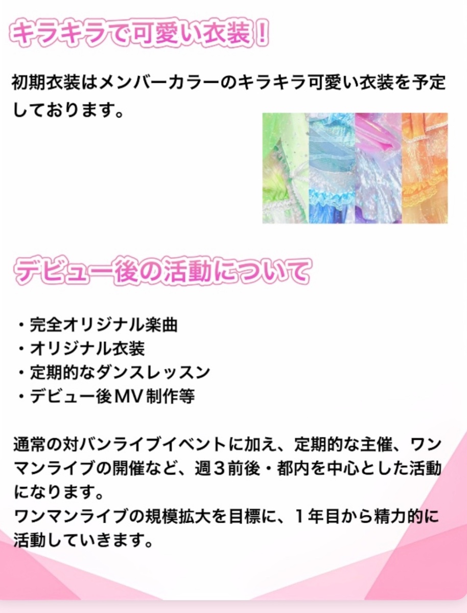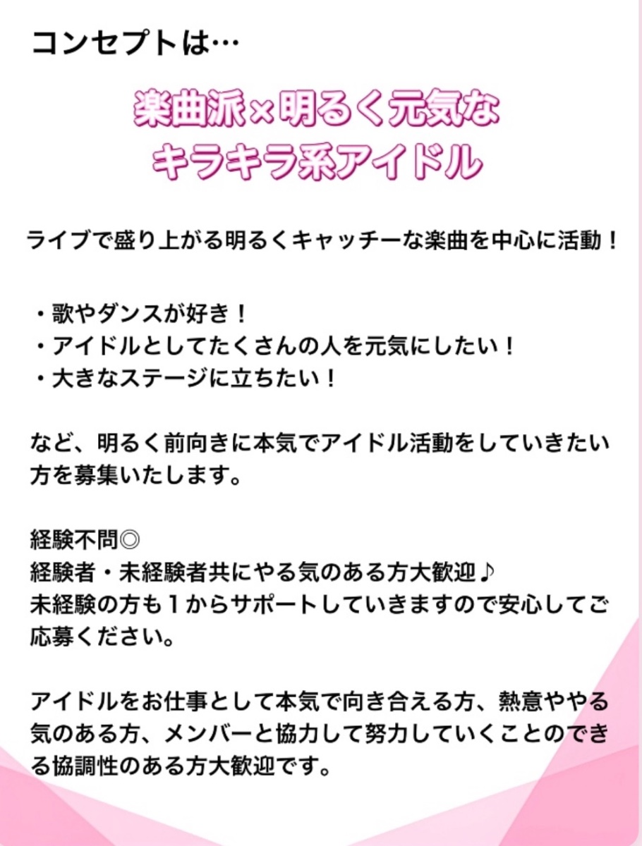 - 新規女性アイドル応募(コピーしてご入力下さい。)①氏名 ②年齢③身長④お住まいの都道府県/最寄り駅⑤SNSアカウントURL(Twitter・Instagram・TikTok等)⑥活動歴 (芸能活動や歌やダンス歴など)⑦志望動機(自己PR含む)⑧歌・ダンスの参考動画(1コーラス程度)⑨顔写真/全身写真【任意項目】・アイドルとしての目標・好きなアイドルグループやアーティスト