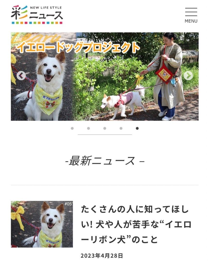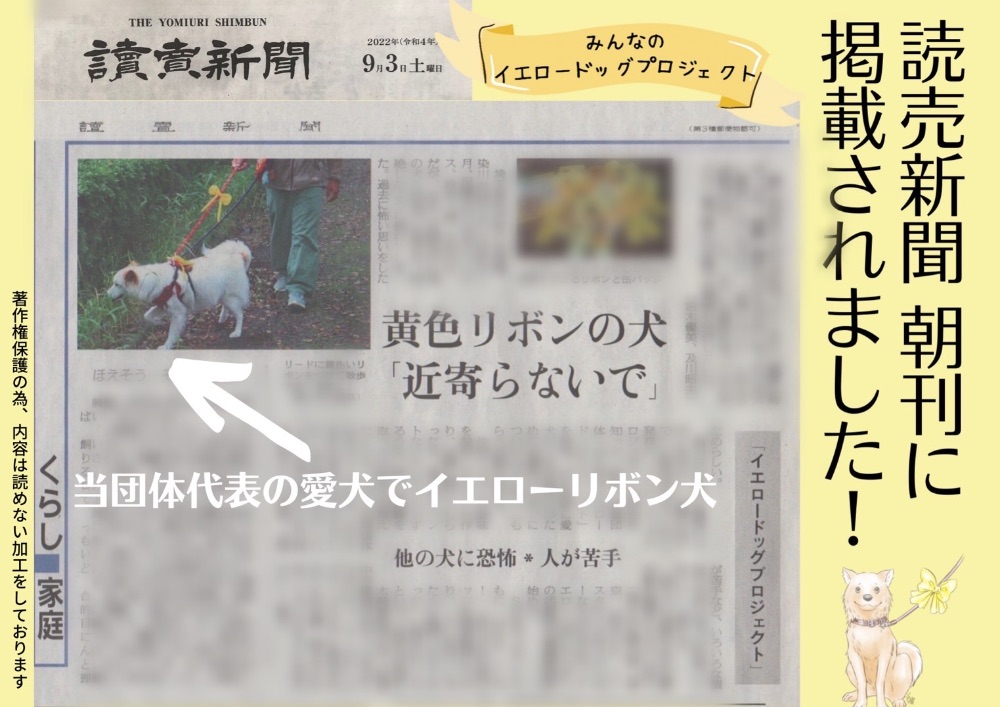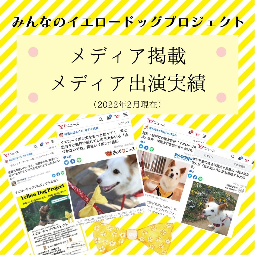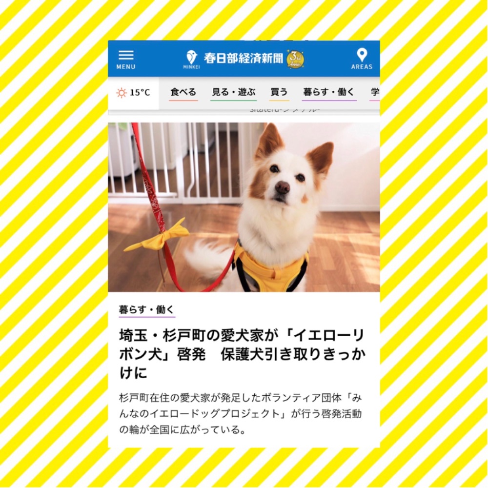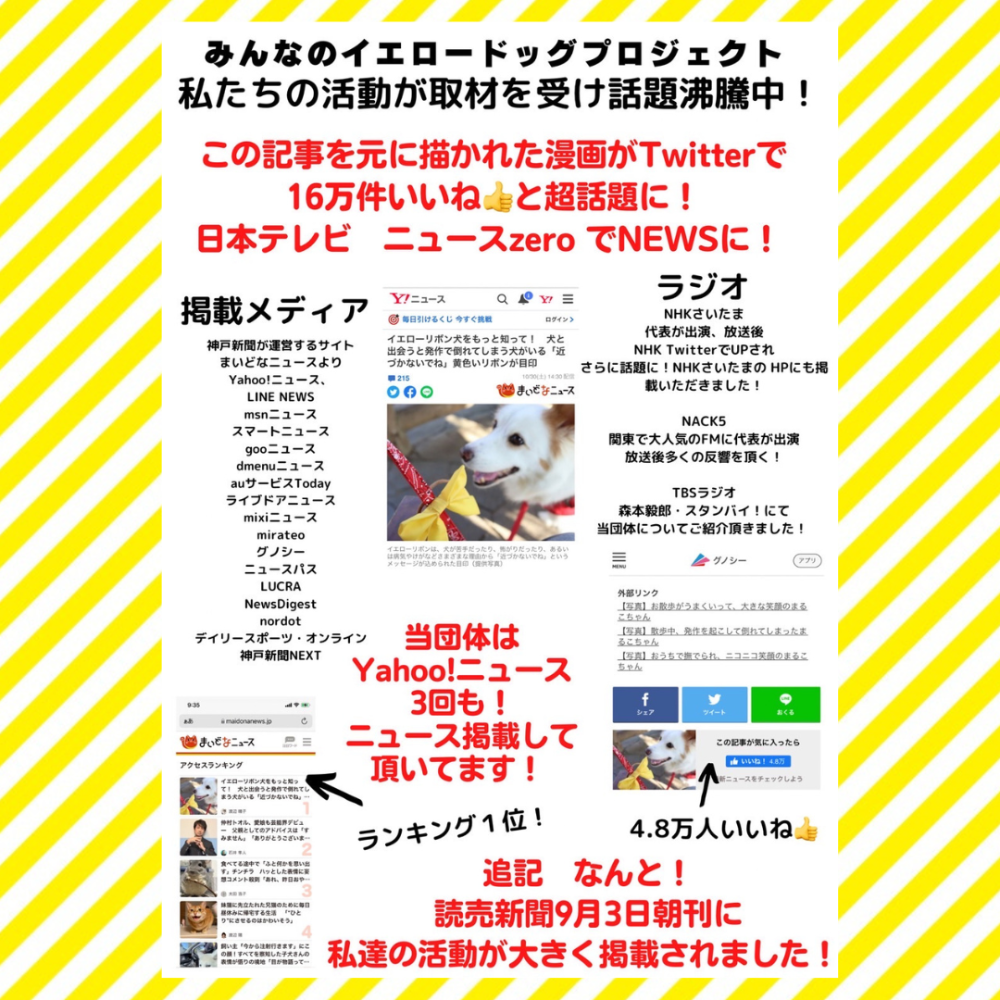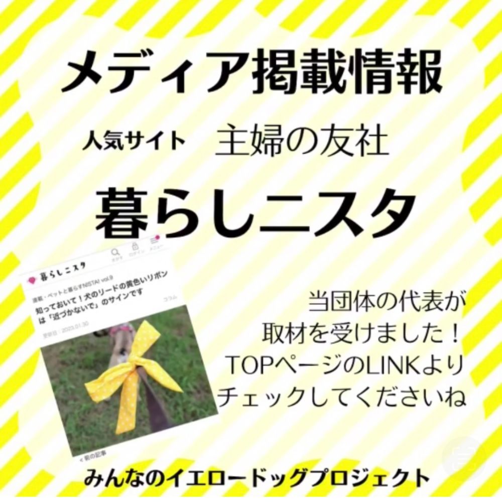 イエロードッグプロジェクトで 日本で初めて大きくメディア報道されたボランティア団体🐶 Yahoo!ニュース.読売新聞,ラジオ,TVで話題に! 犬に黄色いリボン〝近づかないでね♡〟のサイン リボンの共通言語で 双方happy💛 杉戸町本部.大阪支部発足❣️全国へ 【みんなのイエロードッグプロジェクト】は、 おそらく日本で初めて “地域に特化した” イエロードッグプロジェクトの周知活動を行っている 市民のボランティア団体です。 私たちの活動がニュースになり、 イエロードッグプロジェクトが大きな話題となっております。 私共の活動は Yahoo!ニュースに3回 その他、 神戸新聞の運営するまいどなニュース、 デイリースポーツ・オンライン LINE NEWS msnニュース スマートニュース gooニュース dmenuニュース auサービスToday ライブドアニュース mixiニュース mirateo グノシー ニュースパス LUCRA NewsDigest nordot 神戸新聞NEXT 春日部経済新聞(みんなの経済新聞) また、当団体の記事を読んで描かれた四コマ漫画が 16万いいねと反響を呼び 日本テレビ ニュースzero にも取り上げて頂き、 ニュースにする上でご相談頂きました。 助けたい犬と家族がいます。 どうぞ皆様 応援のほど宜しくお願いいたします。