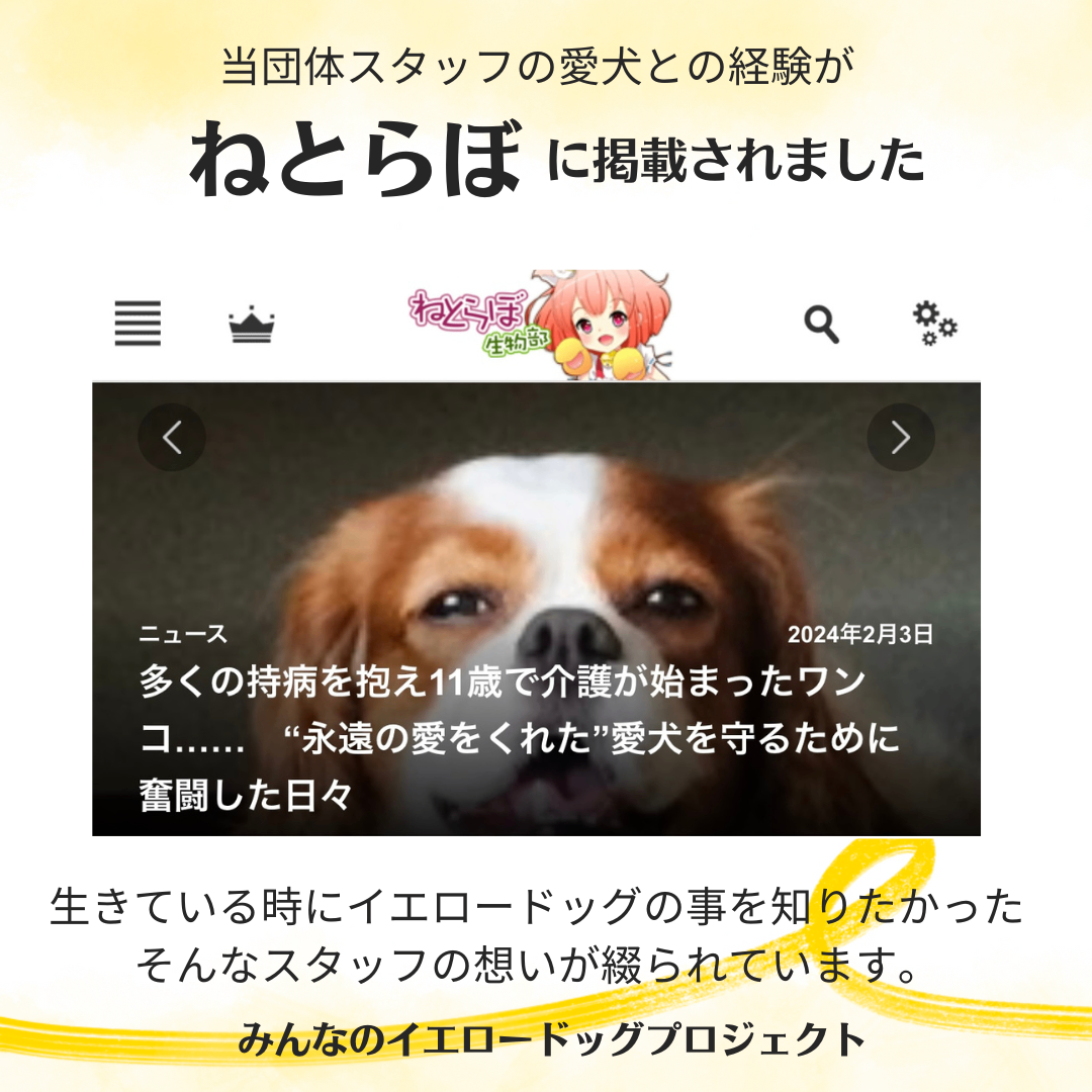 代表の愛犬について、イエロードッグプロジェクトについて、神戸新聞の運営する、まいどなニュース様に取材していただきました。ネコロス様の目に留まったのがこちらの記事です。『この記事で、もっとイエロードッグプロジェクトが広まるようにしましょう。他のメディア、テレビにも取り上げられるように』とは、記事にしてくださった記者さんの言葉です。本当にその通りになりました😭すべての始まりはこの小さな一歩から。ありがとうございます!Yahoo!ニュース様にも掲載されました