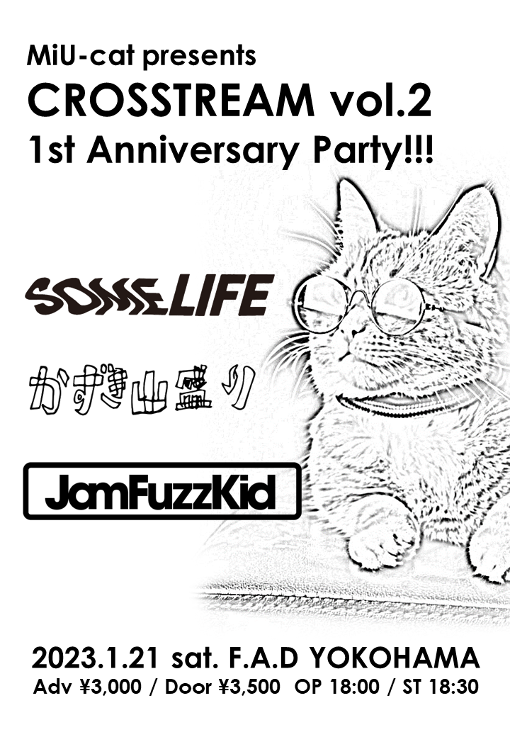 MiU-cat pre. "CROSSTREAM” Vol.2「1周年感謝祭!」Some Lifeかずき山盛りJam Fuzz Kid開場 18:00 / 開演 18:30前売 ¥3,000 / 当日 ¥3,500 +1D🇸🇨Thank You🇸🇨