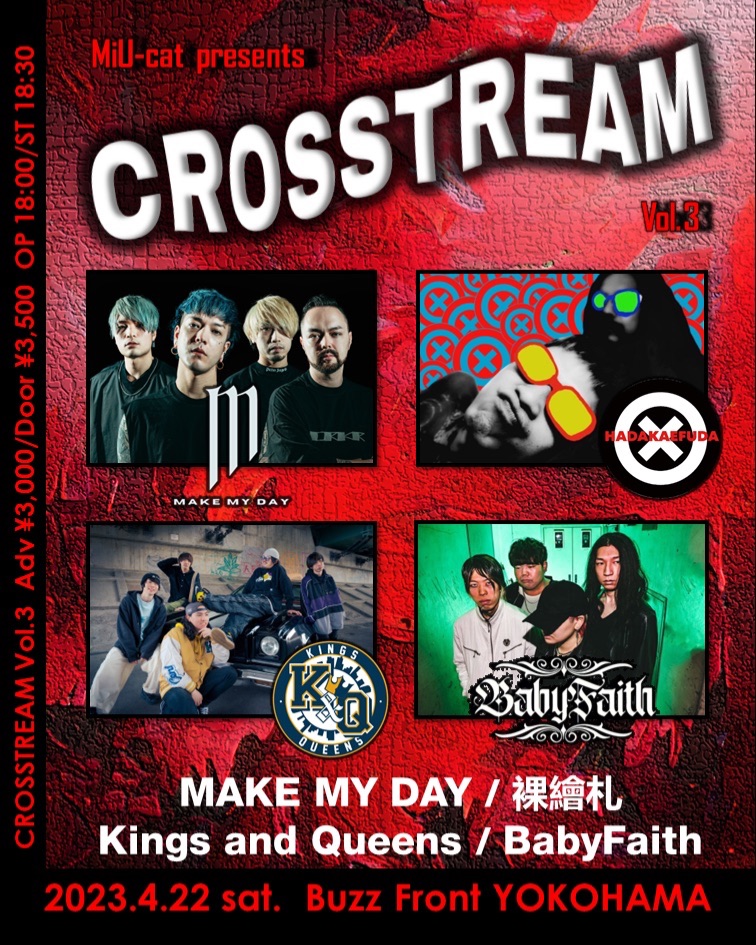 MiU-cat pre."CROSSTREAM” Vol.3MAKE MY DAY裸繪札Kings and QueensBabyFaith2023/4/22(土) BuzzFront YOKOHAMA開場 18:00 / 開演 18:30前売 ¥3,000 / 当日 ¥3,500 +入場時1D💥Thank You💥