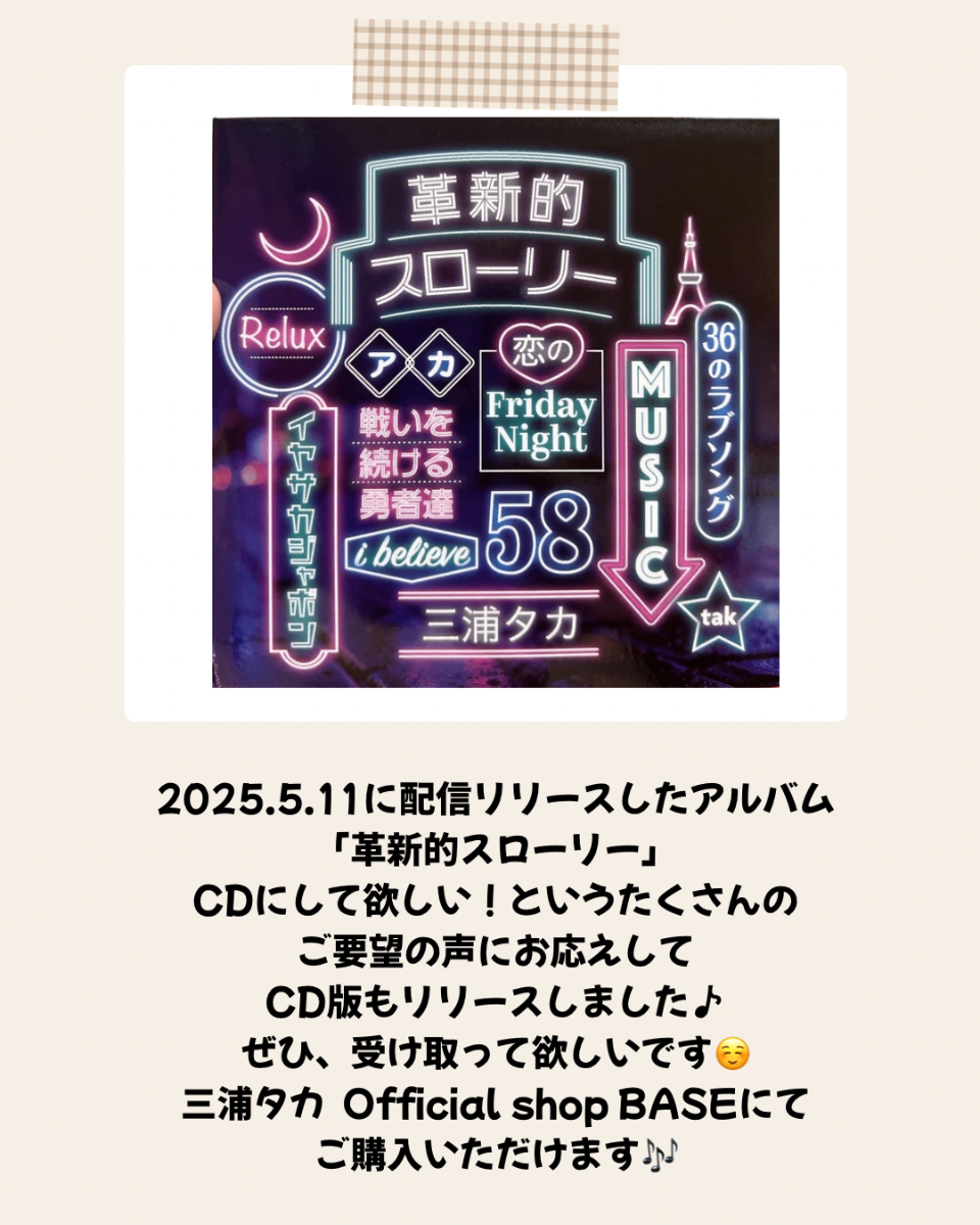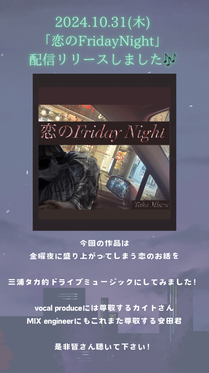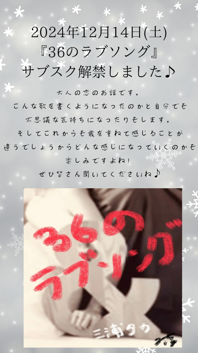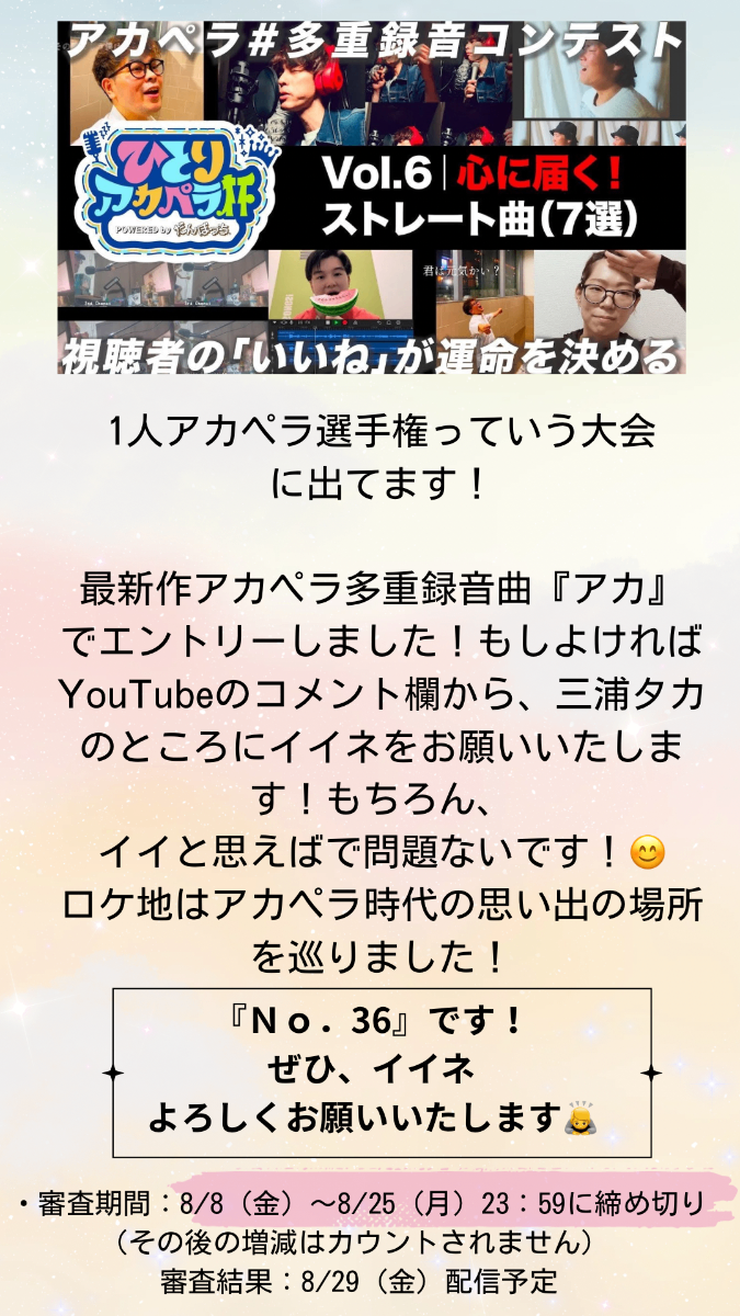 北海道札幌市出身、現在38歳、シンガーソングライター 「三浦タカ」。 アカペラコーラス出身という経歴もあり、ブラックミュージックに強く影響を受けた道産子SOULシンガー。 幼い頃から実家で音楽教室を開き、ピアノや唄を教え、ジャズシンガーでもある母の影響を大きく受け、父は、詩吟の全国大会入賞歌手の経歴もあり、姉はオペラ歌手、妹はサックスプレイヤー、弟と共にアカペラグループを結成しハモネプで優勝した経験があり、そんな音楽一家の長男として育つ。 現在はシンガーソングライターとして活動している。主に、作詞作曲、楽曲提供、コーラスサポート、コーラスアレンジ、ボイストレーナー、ボイスディレクター、仮歌などの依頼も受け付けております。そして役者として舞台など様々な活動をしております。▤ ▥ ▦ ▧ ▤ ▥ ▦ ▧ ▤ ▥ ▦ ▧ ▤ ▥ ▦ ▧ ▤ ▥ ▦ ▧✤2008年 フジテレビハモネプにて755組の頂点に立つ。その時、コーラスアレンジ、リードボーカルを担当した✤その後TBS系列の北海道HBCラジオにて2年間レギュラーラジオ番組を持つ。✤2013年からソロ活動を開始✤2014年2月 ゴスペラーズの黒沢薫氏出演イベントでオープニングアクトを務める。✤2014年 5月 研ナオコ氏のイベントにて前座を務める。✤2014年 6月 旧国立競技場にて最後の国歌斉唱アーティストを務める。✤2014年 TBSオーディション番組『Sing×3』の3rdシーズンでは約3000人の中からTop12まで上り詰める✤2017年 映画『Sing』の日本語吹き替え版でMISIAさんのコーラスを務める。✤2019年 全国47都道府県ツアー完走。✤2023年 舞台『レ・ミゼラブル』にて舞台役者デビュー。✤2024年6月 TEEさんのイベント『TEE's night』に出演をかけたオーディションに挑戦し見事に優勝を勝ち取る。6月13日に『TEE'S Night』jにてTEEさんと「TAA」として、コラボ出演を果す。まだまだ戦いを続けている真っ最中!天パで奥二重、甘えベタな長男「TAA」こと「三浦タカ」です。LIVE情報🎤
