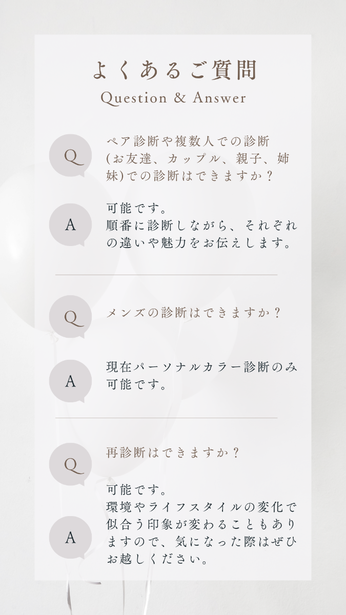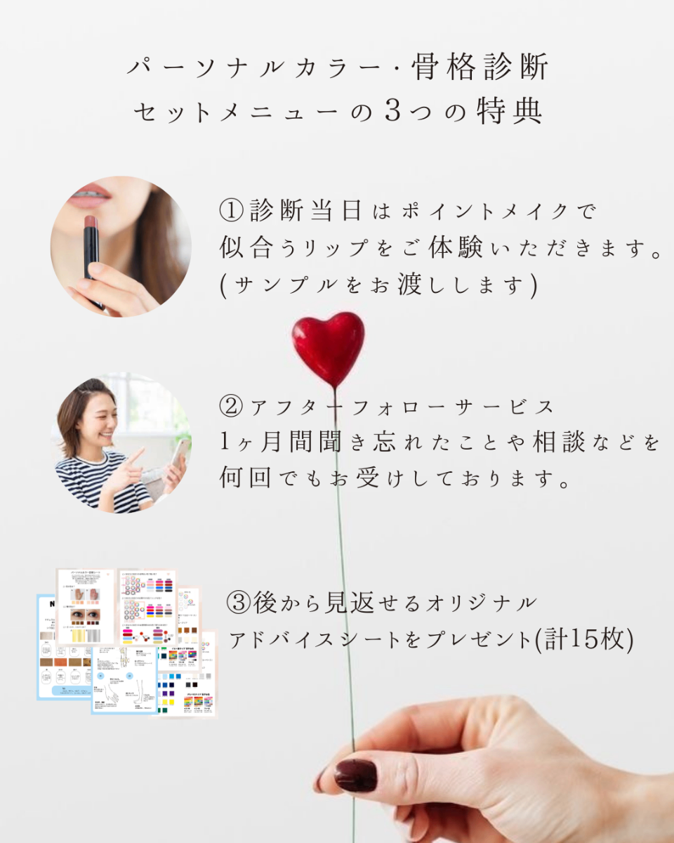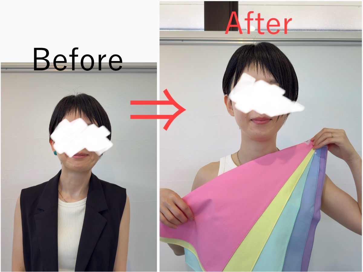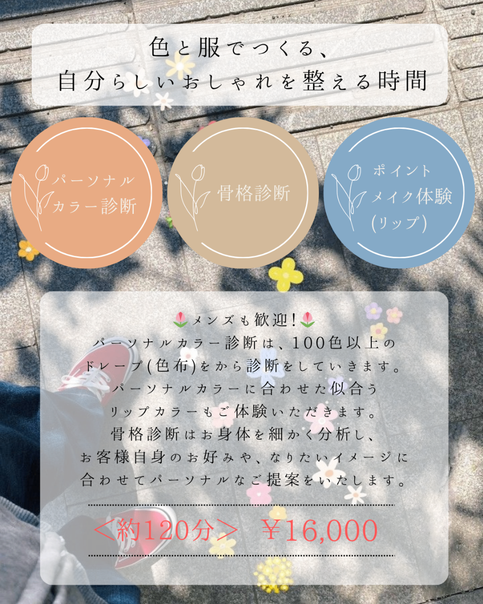 診断でわかることはこちらです🌼✔肌が明るく、透明感が出る「似合う色のグループ」✔苦手な色の傾向と、その活かし方✔似合うリップ・チーク・アイシャドウ・ヘアカラー✔好みとのバランスの取り方 ( が好きな方にはこう取り入れるなど)✔色によって変わる「第一印象」✔スタイルが良く見える 「服の形・素材・着こなし方」✔身体のラインをきれいに見せる服の選び方✔着太り・違和感の原因がどこにあるか く小物やアクセサリーの選び方 (バッグ・靴・首元の開け方など)✔なりたいイメージに近づける“似合わせのコツ”