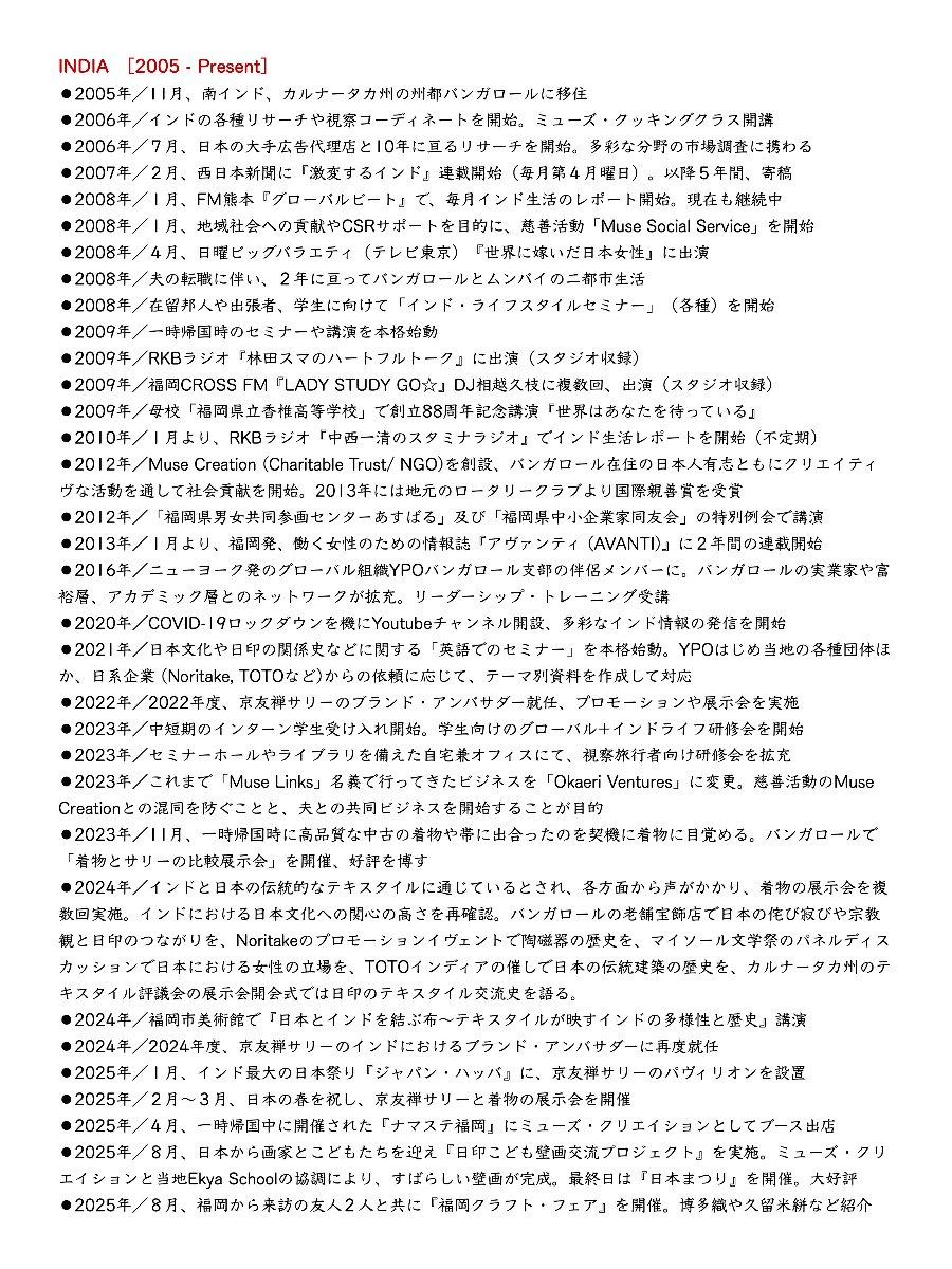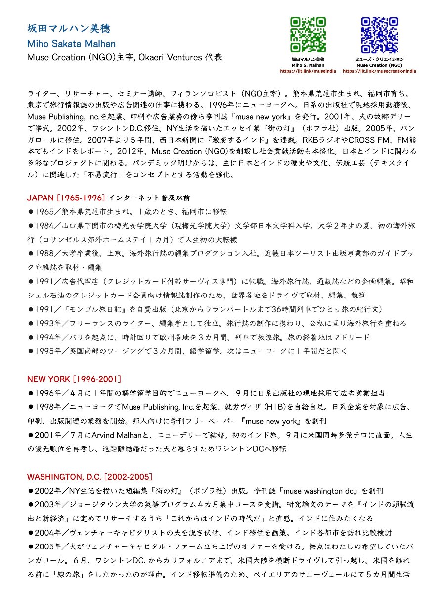 Miho Sakata Malhan Founder, Muse Creation (NGO) ;Writer, Editor, Researcher. Born in Kumamoto and raised in Fukuoka. After working as an editor for overseas travel magazines in Tokyo, moved to New York in 1996. After working for a Japanese publishing company, founded Muse Publishing, Inc. in New York. The company managed advertising and printing business for Japanese companies. Published a quarterly Japanese magazine “muse new york”, and Author of a Japanese non-fiction Book, “Machi no Hi” (City Lights). Visited India for the first time in 2001 for marriage, and in 2005, shifted to Bangalore. Speaker and writer on India on Japanese radio, magazines and newspapers. Led India market research projects for leading Japanese advertising agencies and other clients. Conducted seminars on various topics related to Japan and India. Founder of Muse Creation (NGO). Brand Ambassador for Kyoto Yuzen Sarees, an initiative supported by Kyoto Government to express the historical links between India and Japan in heritage.坂田マルハン美穂/Muse Creation (NGO)主宰, Okaeri Ventures 代表、ライター、リサーチャー、セミナー講師、フィランソロピスト(NGO主宰)。熊本県荒尾市生まれ、福岡市育ち。東京で旅行情報誌の出版や広告関連の仕事に携わる。1996年にニューヨークへ。日系の出版社で現地採用勤務後、Muse Publishing, Inc.を起業、印刷や広告業務の傍ら季刊誌『muse new york』を発行。2001年、夫の故郷デリーで挙式。2002年、ワシントンD.C.移住。NY生活を描いたエッセイ集『街の灯』(ポプラ社)出版。2005年、バンガロールに移住。2007年より5年間、西日本新聞に『激変するインド』を連載。RKBラジオやCROSS FM、FM熊本でもインドをレポート。2012年、Muse Creation (NGO)を創設し社会貢献活動も本格化。日本とインドに関わる多彩なプロジェクトに関わる。パンデミック明けからは、主に日本とインドの歴史や文化、伝統工芸(テキスタイル)に関連した「不易流行」をコンセプトとする活動を強化。詳しい履歴は下部に添付