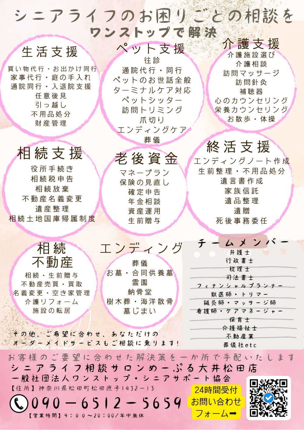 「めーぷる大井松田店」 は シニア世代、そしてご家族の【よろず相談室】です シニアライフにおけるさまざまな問題や不安、悩み、困りごとをお持ちの皆様へ 一般社団法人シニアライフカウンセラー協会が運営する相談サロン「めーぷる」をご紹介します。 シニアの生活において、病気や介護をきっかけに 住まいや引越し、介護施設選び、ペット問題、不用品処分、不動産処分、身元保証、後見人、相続、遺言書、終末期医療、看取り、葬儀、お墓、墓じまい、グリーフケアなど、様々な問題が発生します。 そして、これらの問題に対処するために、どこに相談すればいいのか何件も問い合わせたり、迷うことが多々あります。 その点で 私たち「めーぷる」では、お客様のお困りごとをワンストップで解決するお手伝いできる存在です。 「めーぷる」は、元々は札幌を拠点として始まりましたが、今では全国から寄せられる相談に対応できるように成長してきました。全国各地の仲間が集まり、シニアとその家族のために力を合わせています。 相続や終活(シニアライフ)に関する相談で迷っている方々、お困りの方々、ぜひ一度「めーぷる大井松田店」にお問い合わせください。 介護福祉業界20年以上の経験を持つ私たちは、あなたの悩みや問題をワンストップで解決するお手伝いをさせていただきます。 シニアライフを安心して楽しむためのお手伝いを 心からお約束申し上げます。 どんなことでもお気軽にご相談ください。