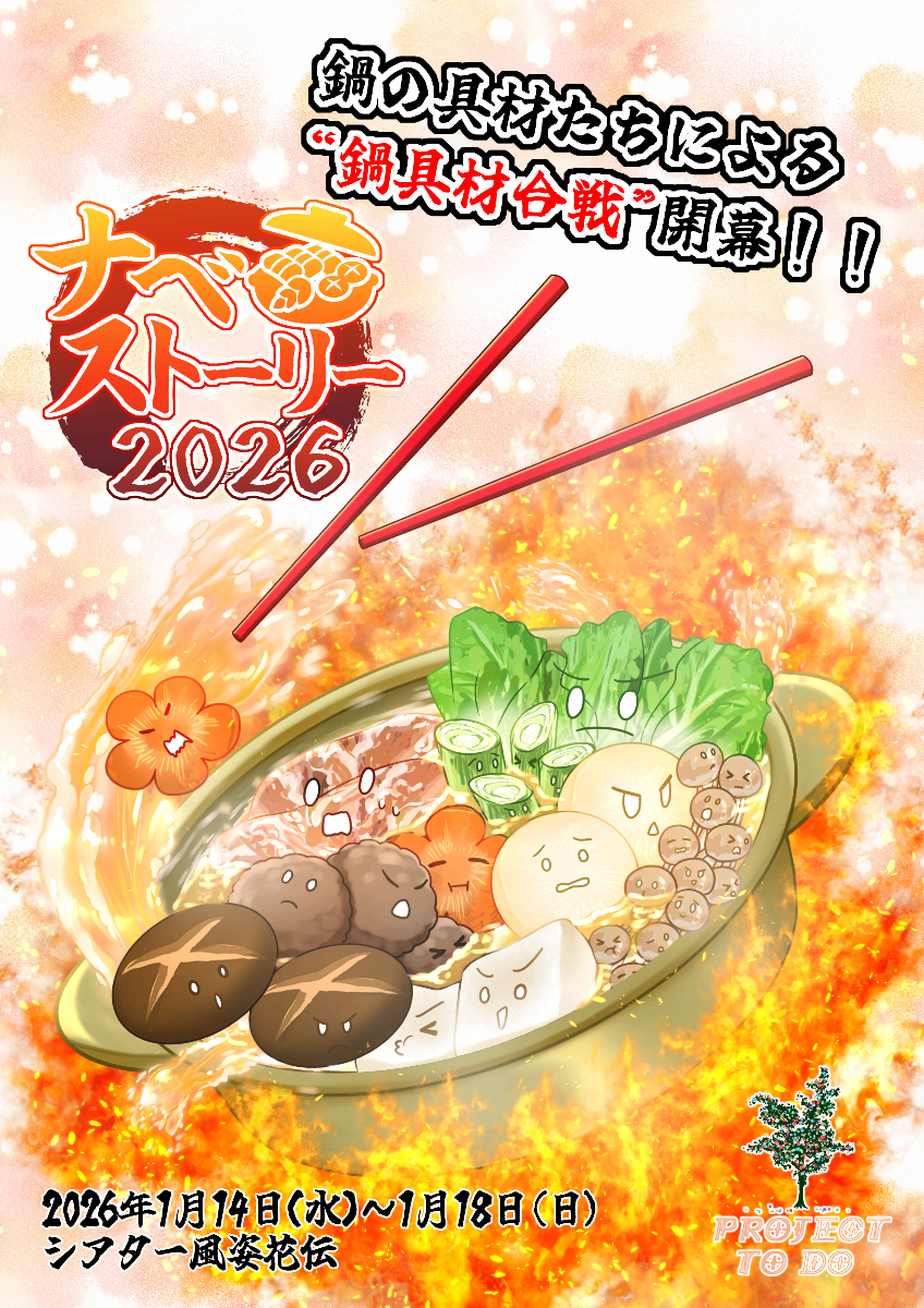 脚本・演出 中尾陽太 【あらすじ】 日本人が愛してやまない料理…「鍋」 その家の主もまた、祝い事に鍋の企画を考えていた。 しかし、そこには私たち人間が知る由もない、人々からの人気とプライドをかけた鍋具材合戦が執り行われていた…。 果たして!この戦いを勝ち残り、人気No1となる具材は如何に!? 今ここに、鍋の具材たちによる鍋具材戦争が始まる! ※この物語はフィクションです。