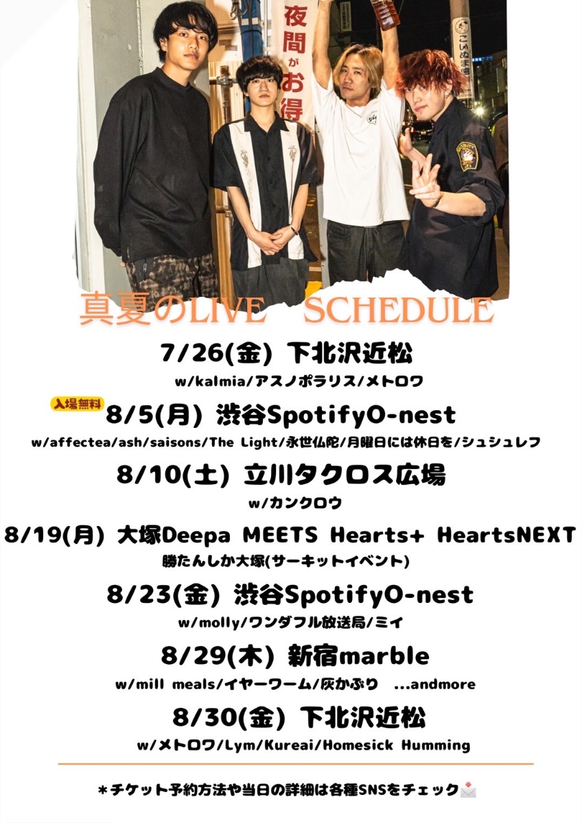 Vo/Gt 西戸魁一 Gt 井上 虎浩 Ba 山村 知生 Dr.Cho 小野寺 啓斗 取り置きのご連絡等は 1番下のお問い合わせからメールでお待ちしております!