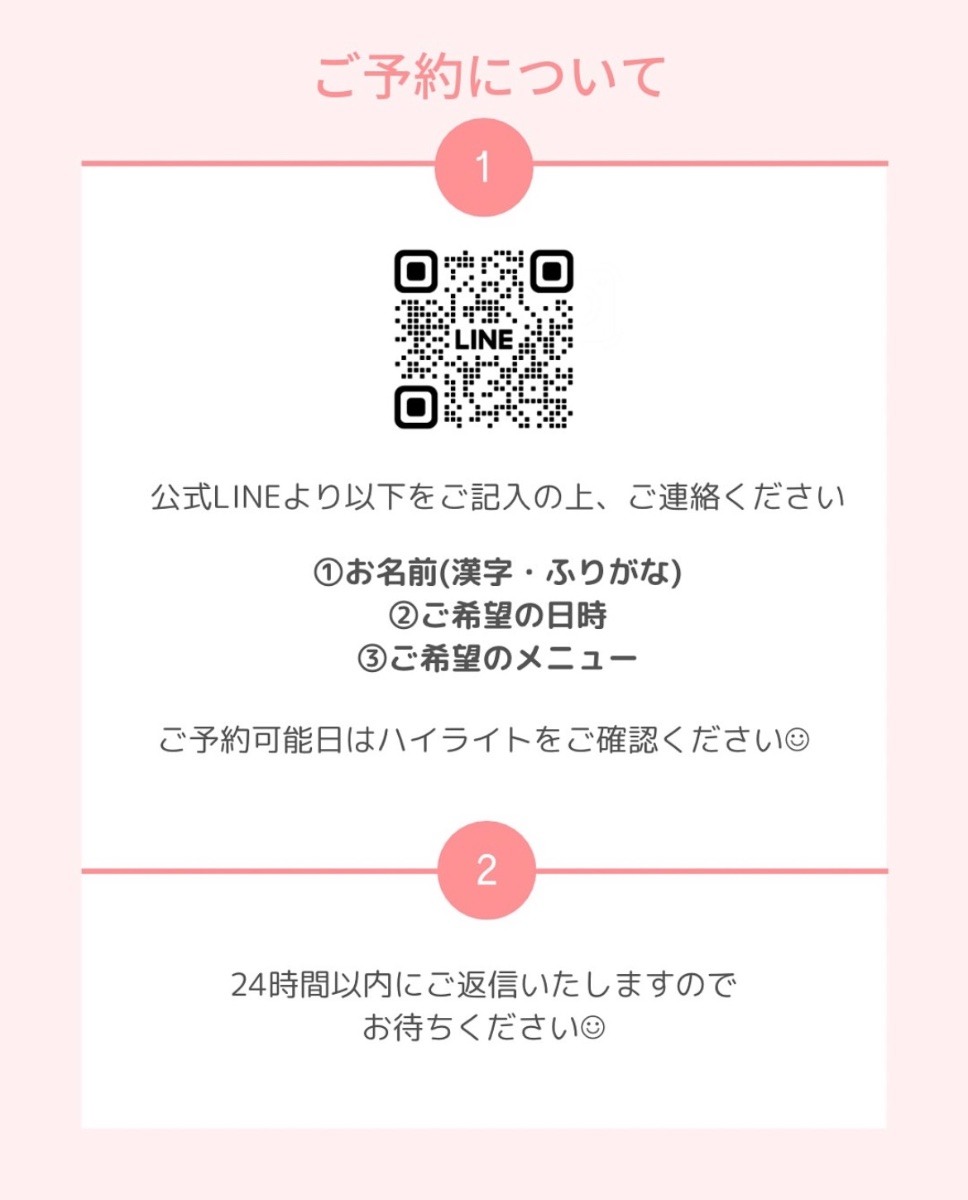 ①お名前(漢字、フリガナ)②ご希望のメニュー③ご希望の日時④割引をご利用の場合はご希望の割引をご記入の上、LINEのメッセージよりお問い合わせください。(ご予約可能日は以下カレンダーをご確認ください☺︎最新状況の反映に時間がかかる場合がございますので、あらかじめご了承ください)