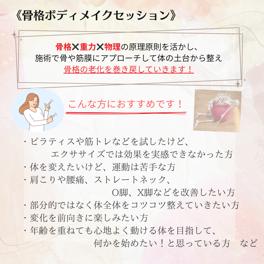 骨格から身体を心地良く美しくへのお手伝い いくつになっても楽しめる身体へ