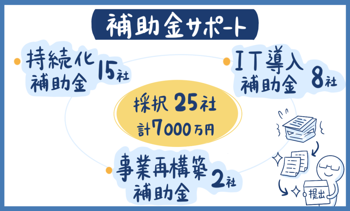 現在、補助金単独での相談・受注は休止しており、経営の総合サポートの中で必要な際に補助金支援をさせていただいております。
