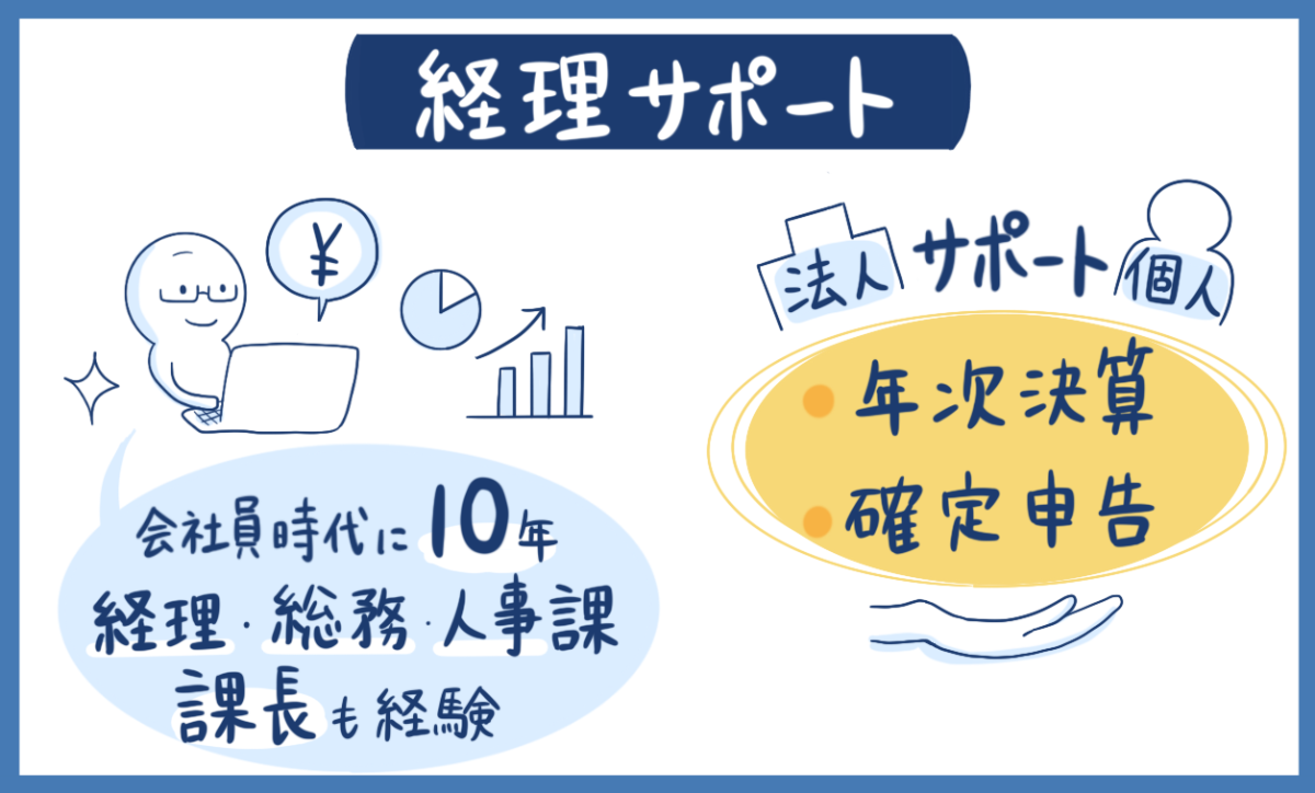 起業後もその経験を活かし、確定申告のサポートから、毎月の経理業務・事務作業の代行やサポートを、個人事業主から法人まで幅広く行ってきました。