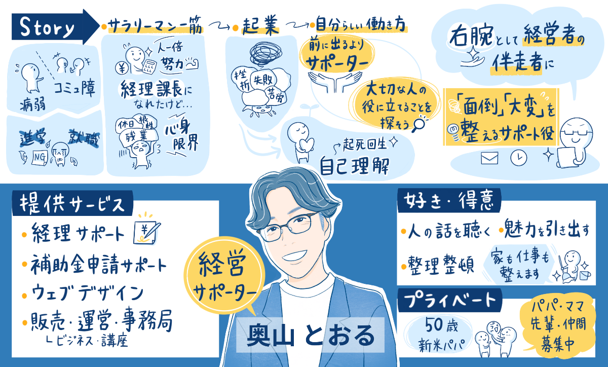 そこから長年の経理・人事・総務経験や独立後のビジネス経験を活かし、"経営者の伴走者・総合サポーター"として経営相談、経理・財務、規定・書類・資料作成などのトータルサポートを行っています。