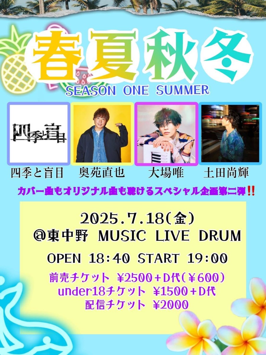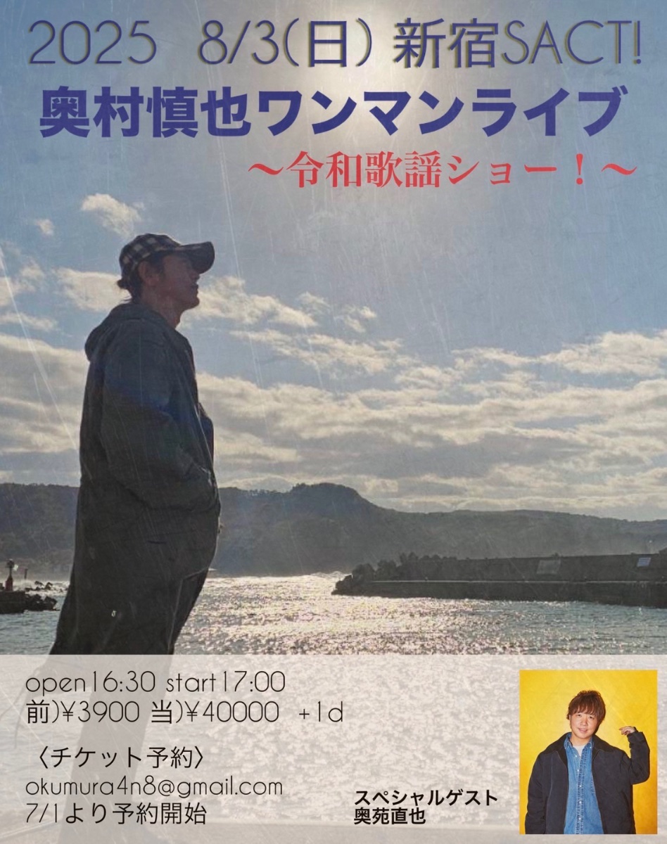 2025/7/18 (金)@東中野MUSIC LIVE DRUM「春夏秋冬」夏のイベント!!夏のカバーソングも歌います!!【出演】トップバッター 19時から2025/8/3(日)@新宿SACT!奥村慎也誕生日LIVE~令和歌謡ショー!~ゲスト出演!!open:16:30 start:17:00詳細は下記画像から ご予約は各種SNSにDM又はGmailまで。お問い合わせ・お仕事依頼・ライブのご予約はこちら