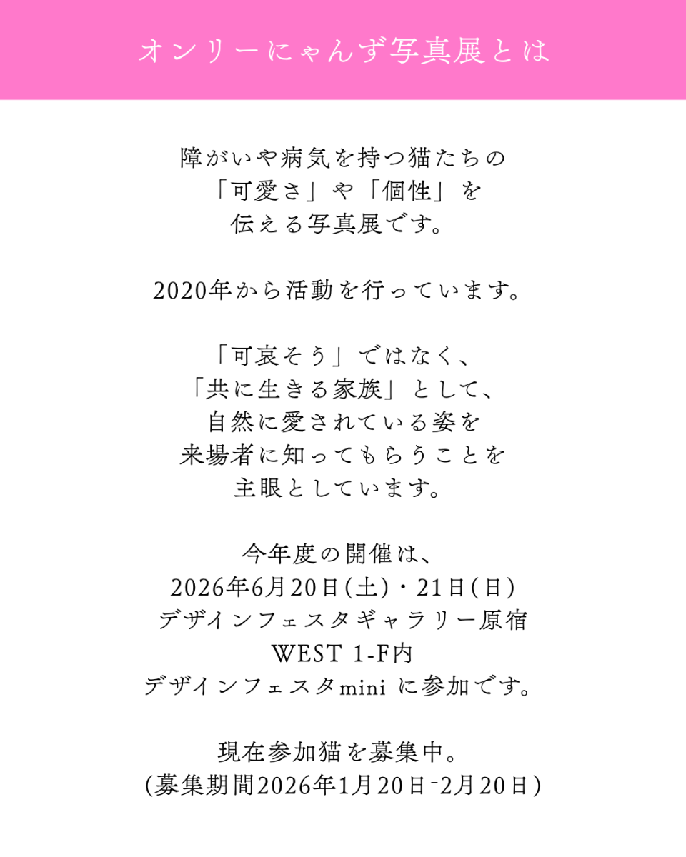 「オンリーにゃんず」は、写真展を中心に、障がいや病気を抱えながらも、凛として生きる猫たちの姿を伝えるささやかな活動を行っています。
