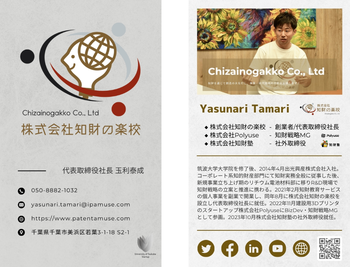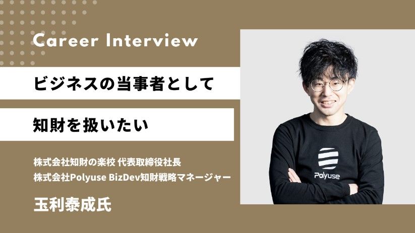 筑波大学大学院を修了後、2014年4月出光興産株式会社入社。コーポレート系の知的財産部門にて知財実務全般に従事した後、新規事業立ち上げ期のリチウム電池材料部に移り開発現場で知財戦略の立案と推進に携わる。2021年2月副業で知財教育サービスの個人事業を開業し、同年8月法人化を経て株式会社知財の楽校の代表取締役社長に就任。2022年11月建設テックベンチャーの株式会社PolyuseにBizDev知財戦略マネージャーとしてジョイン。2023年10月株式会社知財塾の社外取締役に就任。