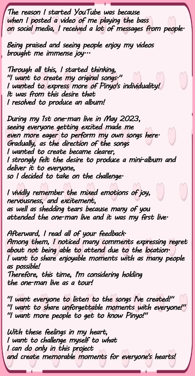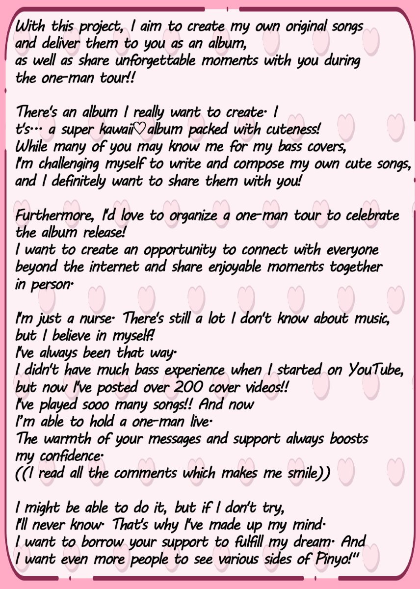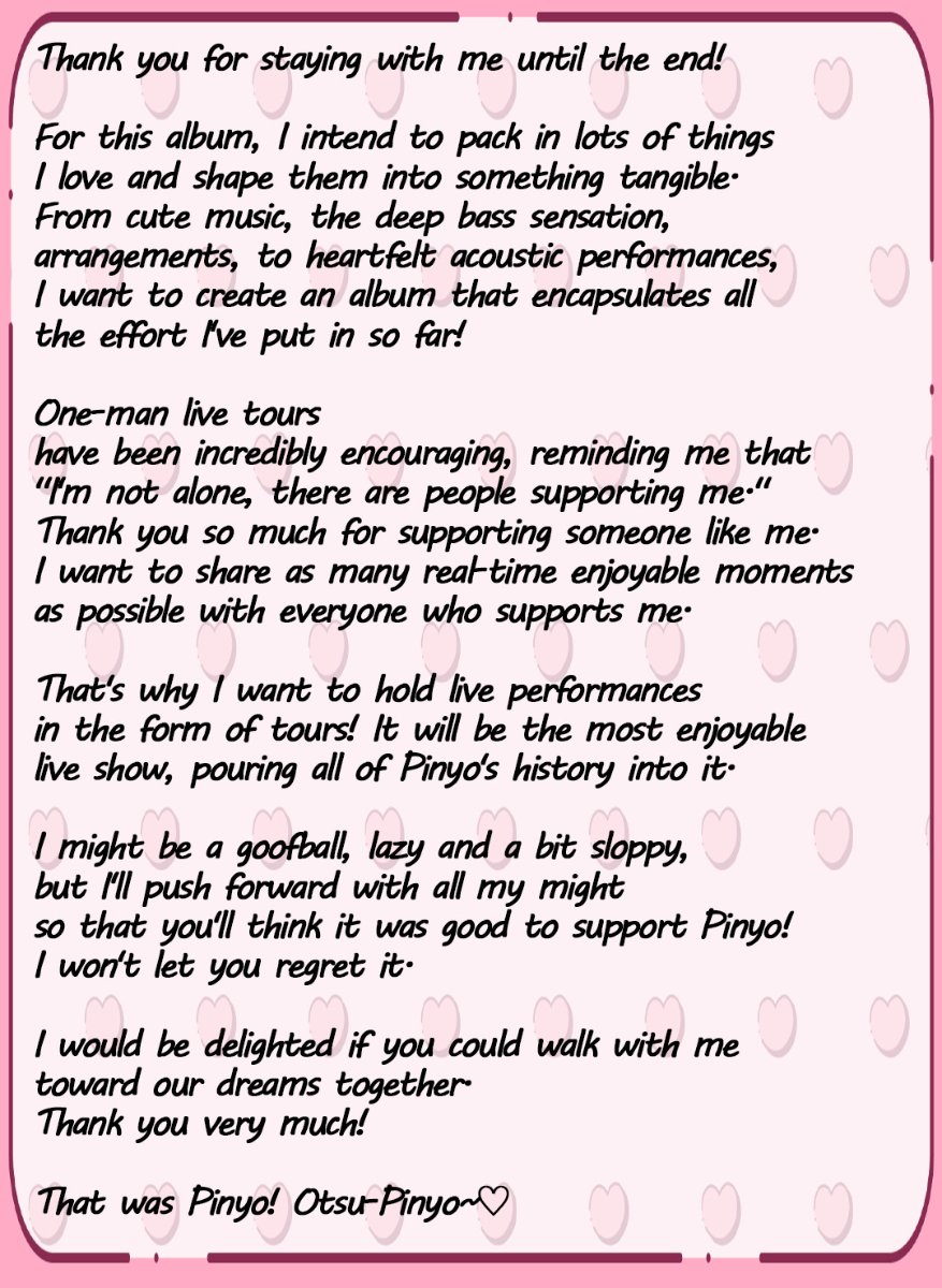 - [Crowdfunding Limited Design Signed Album]10,000 yen / Unlimited- Receive Pinyo's first mini-album in a limited crowdfunding edition with a signature♡I'll make a limited edition that you can only get here! I'll sign each one with all my heart.*Note: The track list will be the same as the regular edition.