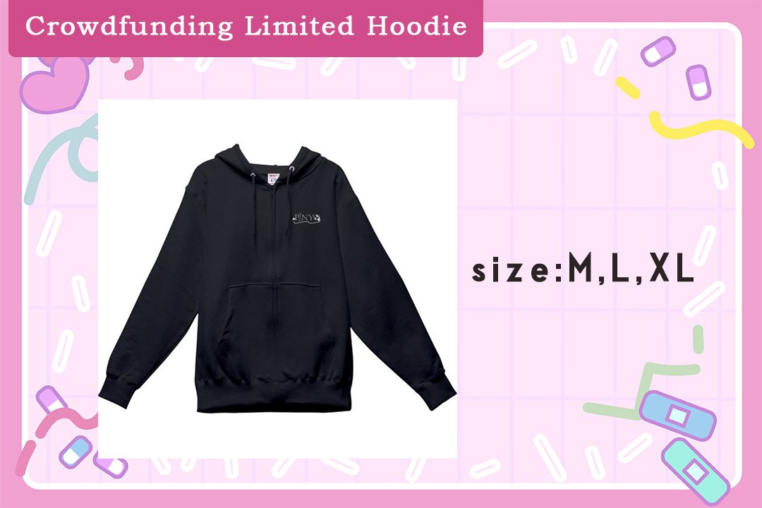 - [Crowdfunding Limited Hoodie]10,000 yen / Unlimited- Receive a hoodie with a limited crowdfunding design♡A simple and cute hoodie designed by Pinyo!You can wear it at home or outdoors to be with Pinyo anytime!!!Color available: black only.Sizes available: M, L, XL. Please choose from the following three sizes.M: Length 67, Shoulder 49, Width 57, Sleeve 62 (cm)L: Length 70, Shoulder 52, Width 60, Sleeve 63 (cm)XL: Length 73, Shoulder 55, Width 63, Sleeve 64 (cm)