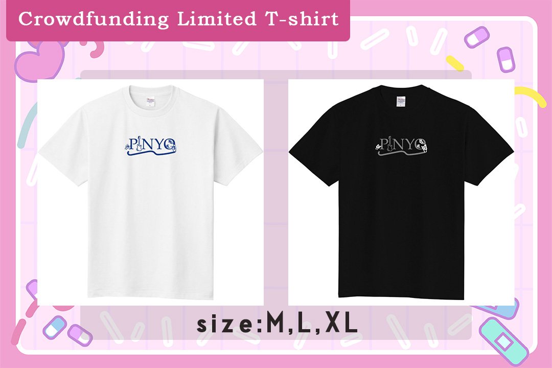 - [Crowdfunding Limited T-shirt]6,000 yen / Unlimited- Receive a T-shirt with a limited crowdfunding design♡A simple and cute T-shirt designed by Pinyo!I think you can use it casually, so spread the word!Colors available: white and black.Sizes available: M, L, XL.Please choose from the following three sizes.M: Length 70, Shoulder 47, Width 52, Sleeve 20 (cm)L: Length 74, Shoulder 50, Width 55, Sleeve 22 (cm)XL: Length 78, Shoulder 53, Width 58, Sleeve 24 (cm)