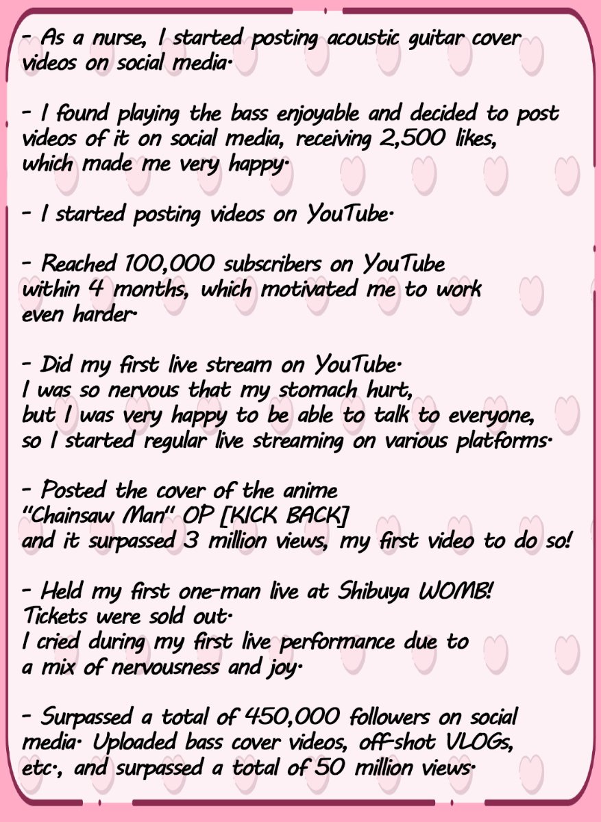 - February 22, 2024: Project StartMarch 30, 2024: Project EndApril 2024 onwards: Reports on the production process and delivery of rewardsMay 2024: Mini-album release, off-eventJune 2024: One-man live tour in Osaka, karaoke streamingJuly 2024: One-man live tour in KoreaAugust 2024: One-man live tour final in Tokyo