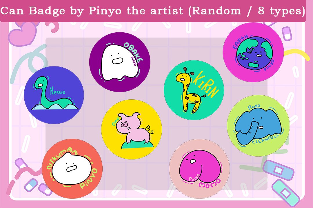 - [Can Badge by Pinyo the artist (Random / 8 types)]500 yen / Unlimited- You'll receive one randomly selected original can badge doodled by Pinyo♡(Round/38mm)*Note: It will be randomly selected from 8 types.Since it's completely random, there may be duplicate designs even if you purchase 8 items.Therefore, we have prepared a purchase website to deliver rewards to overseas customers as well!