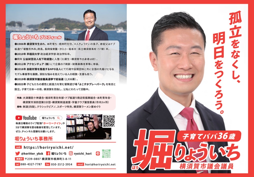 現役子育てパパとして、子育てしやすい環境を整え「暮らしやすさ日本一の横須賀」を実現します。妻と小1の娘と。よこすかプレーパーク共同代表、ドブ板通り商店街振興組合委員。 松下政経塾→アクセンチュア→自殺対策支援NPO→2019年4月 横須賀市議初当選「未来を描く、横須賀で。」