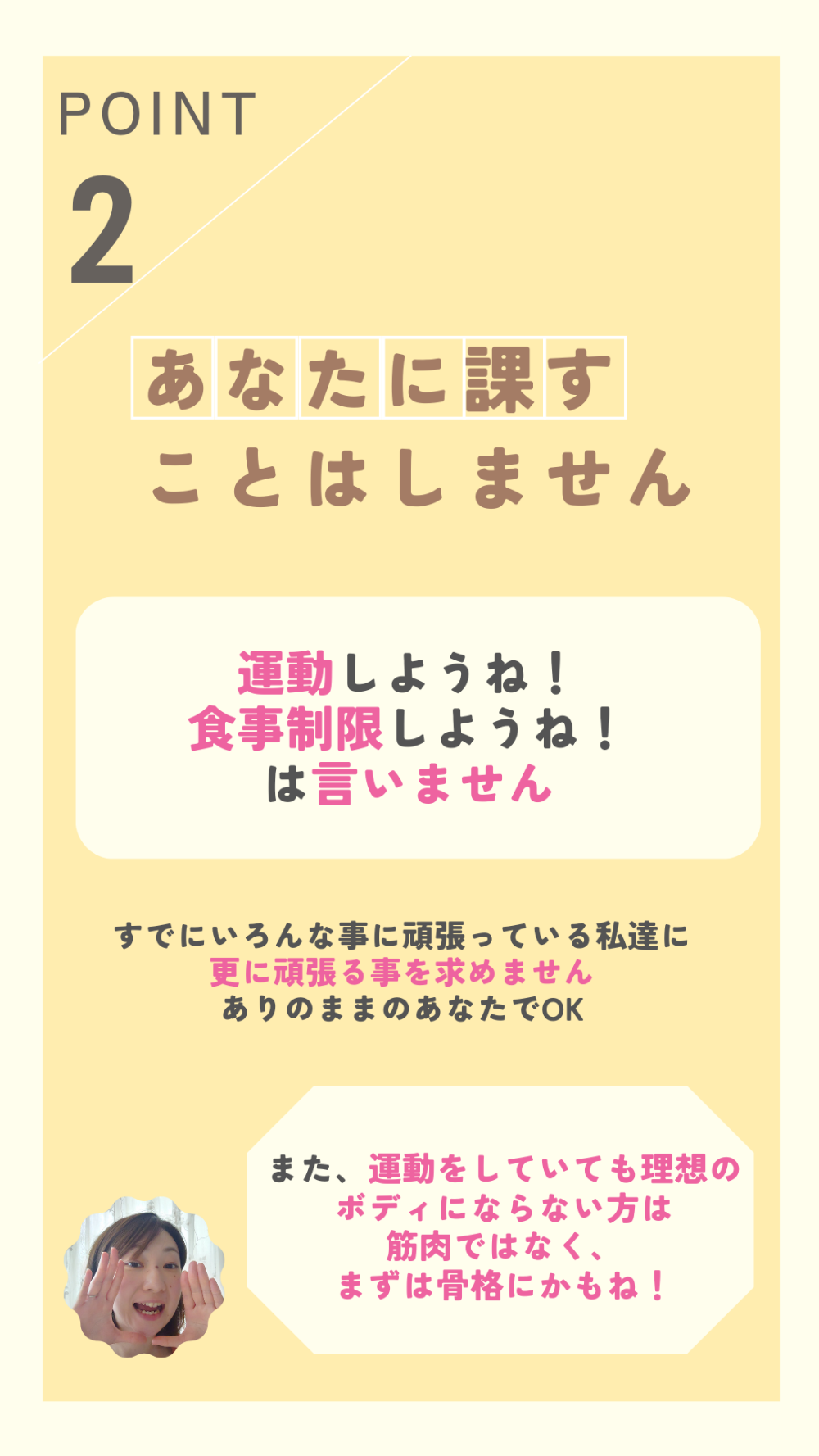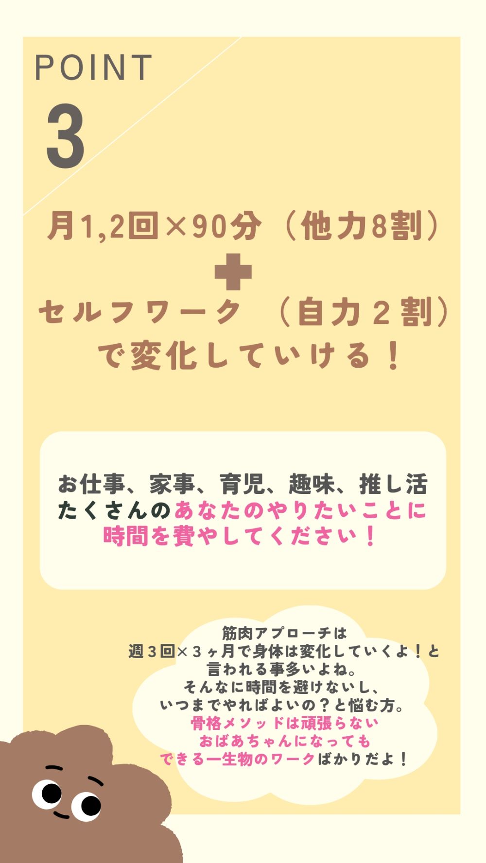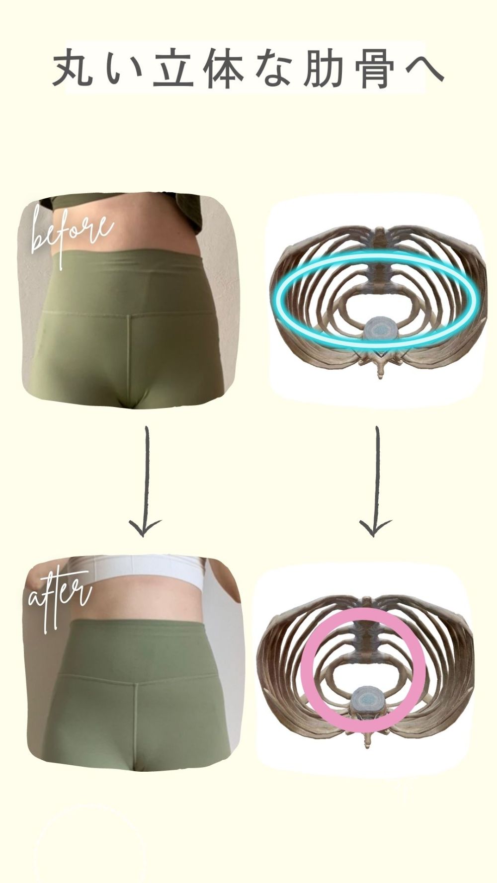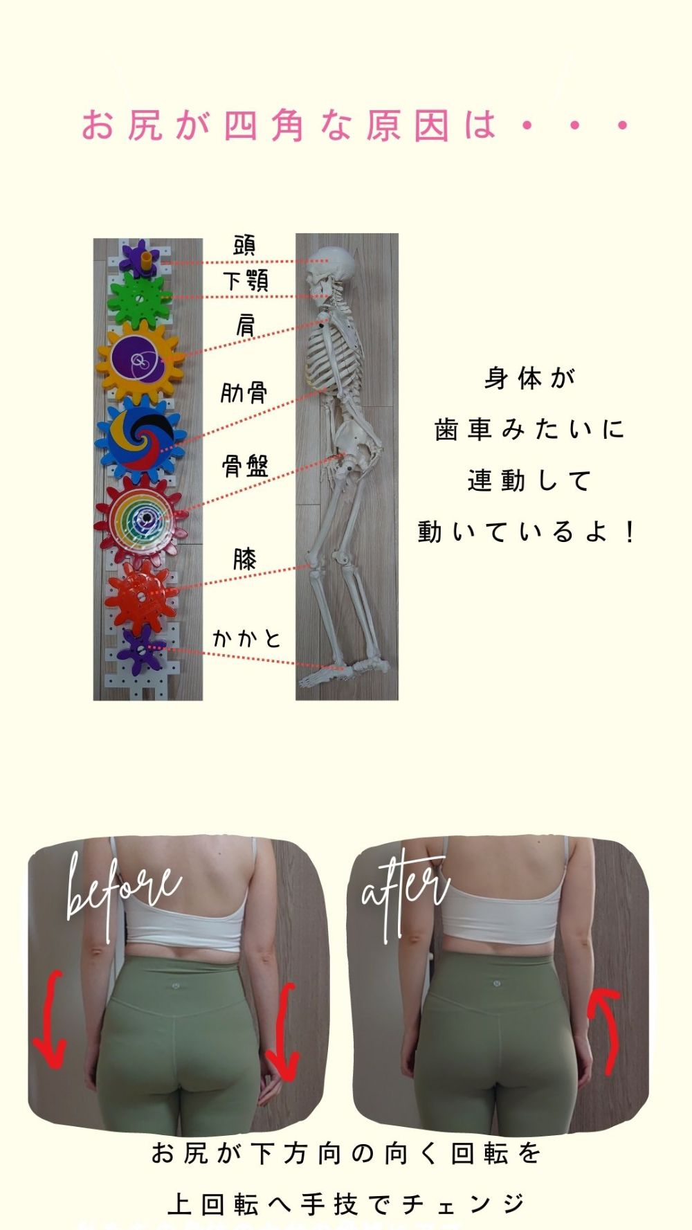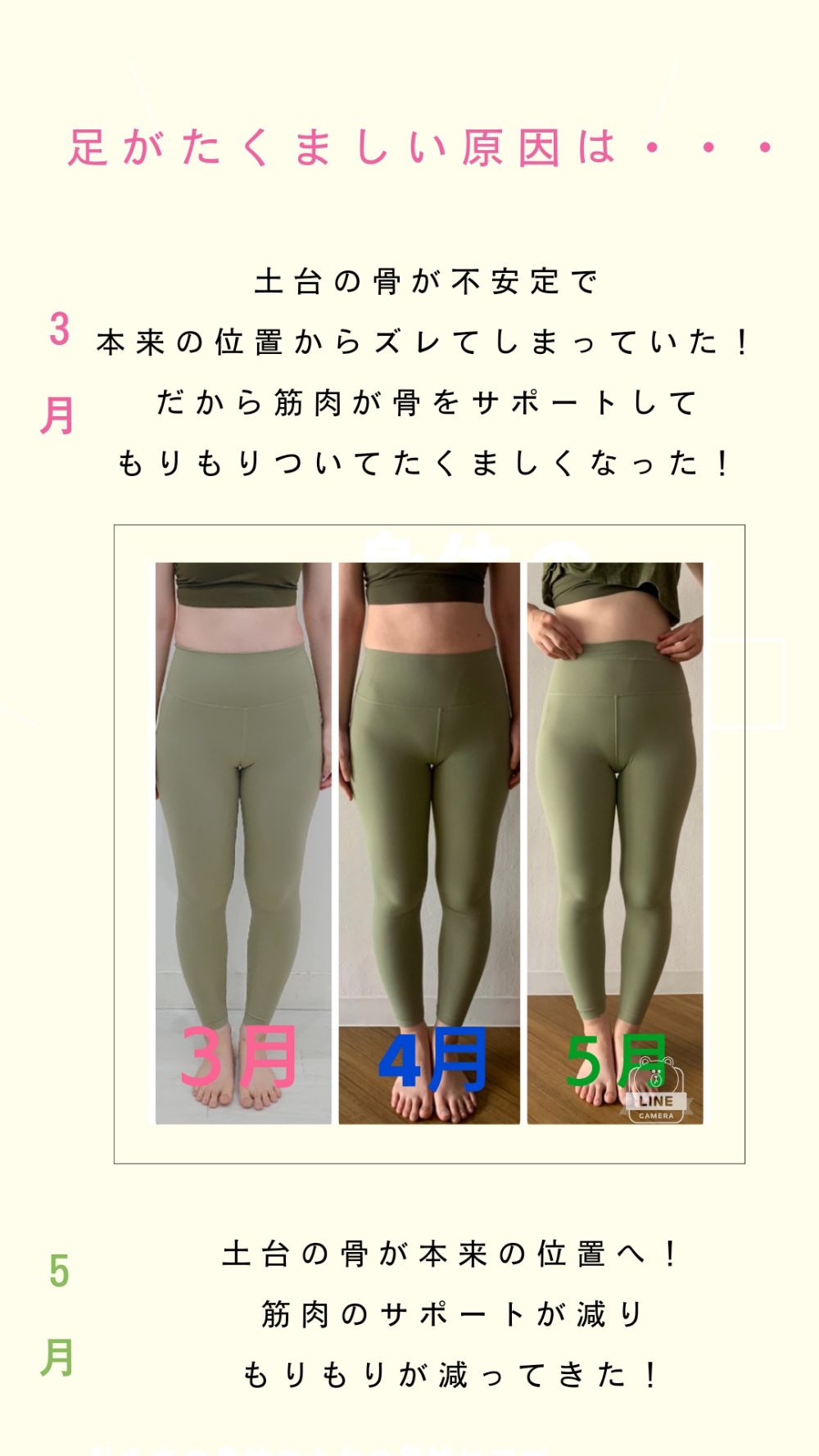 身体の土台である骨格に関心を持つ生活を取り入れることを始めました。 具体的には、月に1度または2度のパーソナルセッションを受けることと、 気が向いた時にセルフワーク(まるまるワーク、転がるワーク)を行うことです。 そんな事で見た目や不調、更に心に対して変化を実感できました。具体的には、いつしかまっすぐにも立ててなかった身体がまっすぐ立てる!肋骨にかまったらおっぱいが中央へ!顔を触らずともどんどん小顔で立体に!また、当たり前すぎてどうにかしたいとも思っていなかった生理痛が、半年で鎮痛剤生活とおさらば!