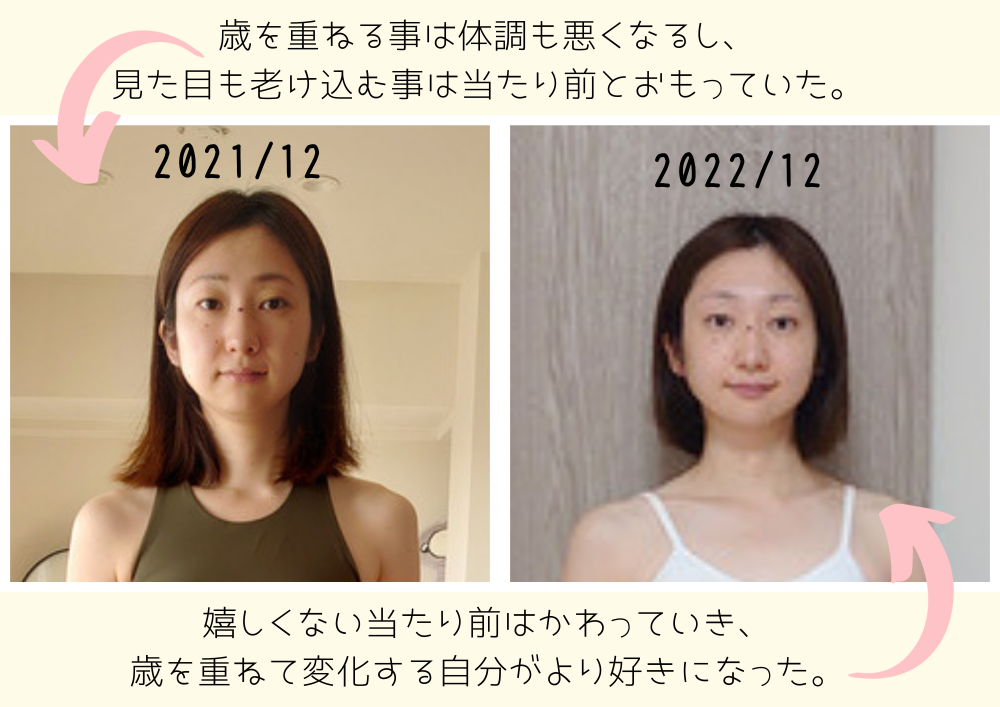 福井県出身で、神戸市に夫と2人で住んでいます。私は、20代後半から腰痛もちで鎮痛剤、湿布頼り、春先のぎっくり腰→整骨院がいつしか当たり前の生活でした。「運動を取り入れましょう!」と先生に言われ始めてみるものの運動が苦手な事もあり長続きがせず、安静にしていれば回復する身体にまだ大丈夫と思っていました。しかし30歳を超えて身体の不調の日が多い日々に漠然と将来が不安になりました。また、鏡をみて見た目が老いていく姿に歳を重ねる楽しさが分からず、「こんなの自分じゃない!もっと自分を好きになりたい!」と思うようになりました。