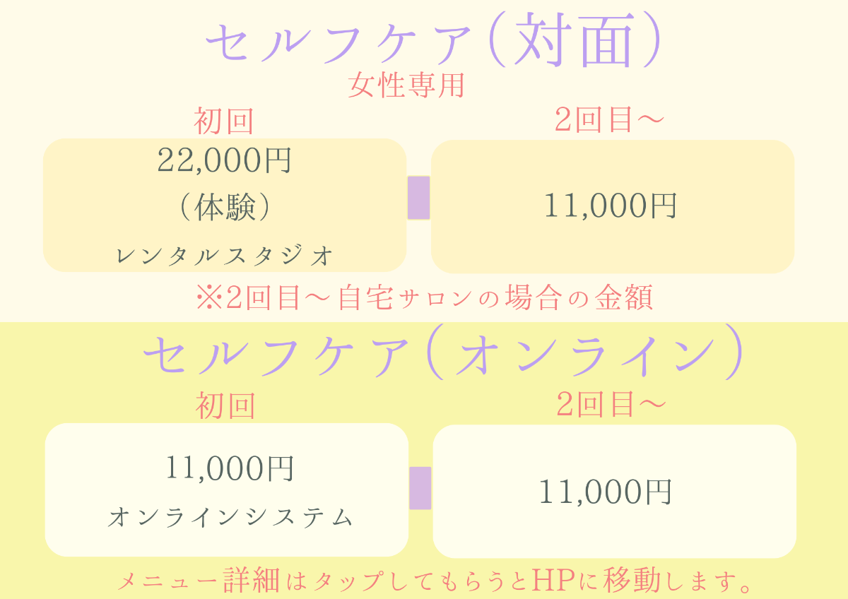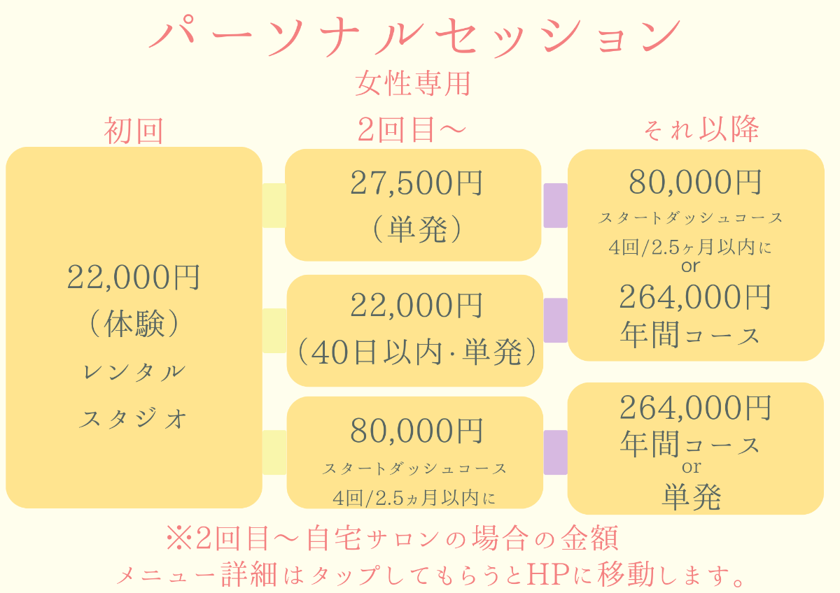 初回神戸または大阪にあるレンタルスタジオからお選び頂くかたちとなっております。2回目〜レンタルスタジオか自宅サロンどちらかをお選び頂けます。レンタルスタジオか自宅サロンでは料金が異なります。具体的な金額はホームページからご覧頂けます。