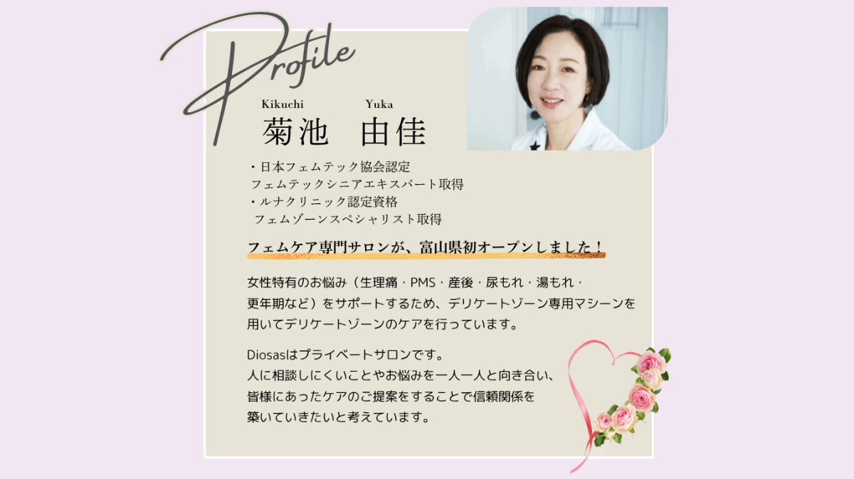 \40代からの私をもっと好きになる/ 富山で唯一のフェムケア専門サロン「Salon Diosas」では、年齢によるカラダや心の変化に寄り添い、あなた本来の美しさと快適さを取り戻すお手伝いをしています。 ✔ 更年期・PMS・尿もれ・黒ずみなどのデリケートなお悩みに対応 ✔ 医療監修の資格を持つ専門家が担当 ✔ 完全プライベート空間で安心ケア ✔ 体験からコースまで丁寧にご案内 はじめての方もお気軽にご相談ください。