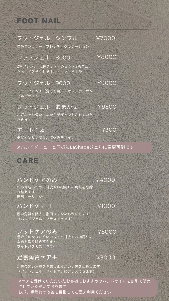 カウンセリングを通じて、お客様のお好み、お洋服、お仕事などに合わせてネイルデザインをご提案させていただきます。お爪に関するお悩みのご相談にものらせていただきます。お爪ケアや育成にも力を入れております。お爪や角質のケアの仕方、適切な栄養を与えると爪の形変わっていきます!ハンドケアやフットケアのみでもお待ちしております。