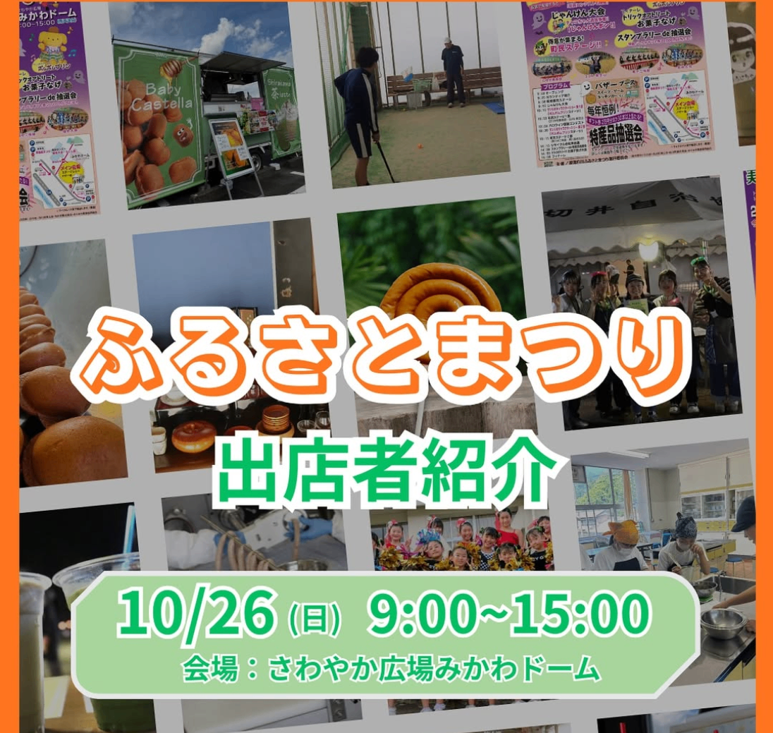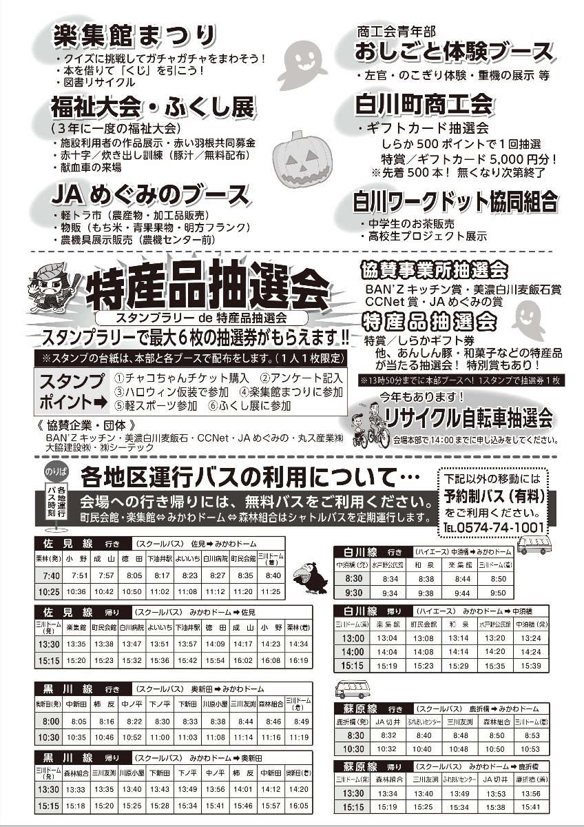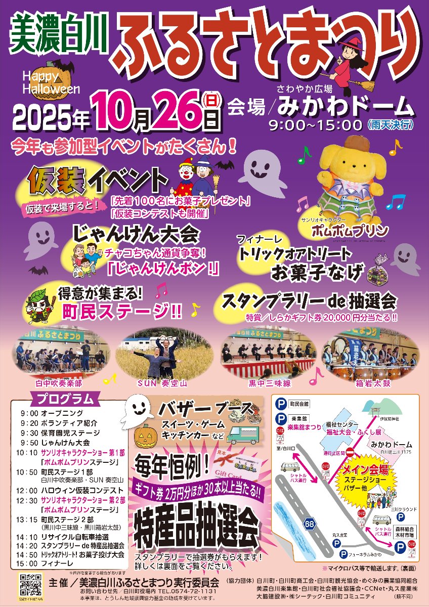 10月26日(日)は「美濃白川ふるさとまつり」! 会場は白川町三川の「さわやか広場みかわドーム」。 ハロウィンをテーマに、“白川町だけの特別な一日”をみんなで楽しもう!