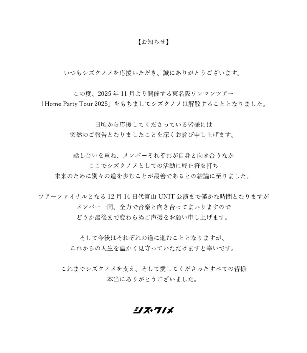 2/8(Thu) シズクノメ HOME PARTY 2024 at TOKIO TOKYO(東京) ※ワンマン