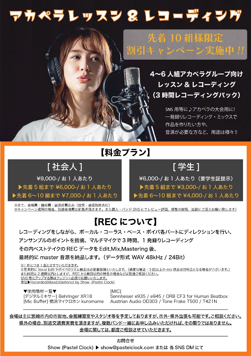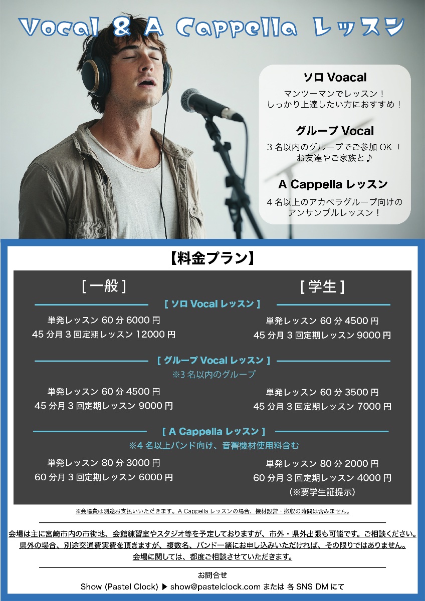 各種レッスン・レコーディング・MIXも行っております。上記プラン以外も行っておりますので、詳しくは、show@pastelclock.comまでお問い合わせください。