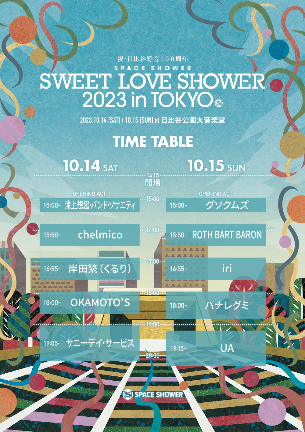 野音100周年を記念しラブシャ生誕の地で開催! 野音時代、山中湖時代を彩ってきたアーティストたちがこの秋10/14(土)・15(日) に集結! <イベント概要> タイトル :祝・日比谷野音100周年 SPACE SHOWER SWEET LOVE SHOWER 2023 in TOKYO 開催 : 2023年10月14日(土)、10月15日(日) OPEN 14:15/ START 15:00 会場 :日比谷公園大音楽堂(日比谷野音) <出演アーティスト> 10月14日(土) サニーデイ・サービス / 岸田繁(くるり) / OKAMOTO'S / chelmico OPENING ACT:浦上想起・バンド・ソサエティ 10月15日(日) UA / ハナレグミ / ROTH BART BARON / iri OPENING ACT:グソクムズ