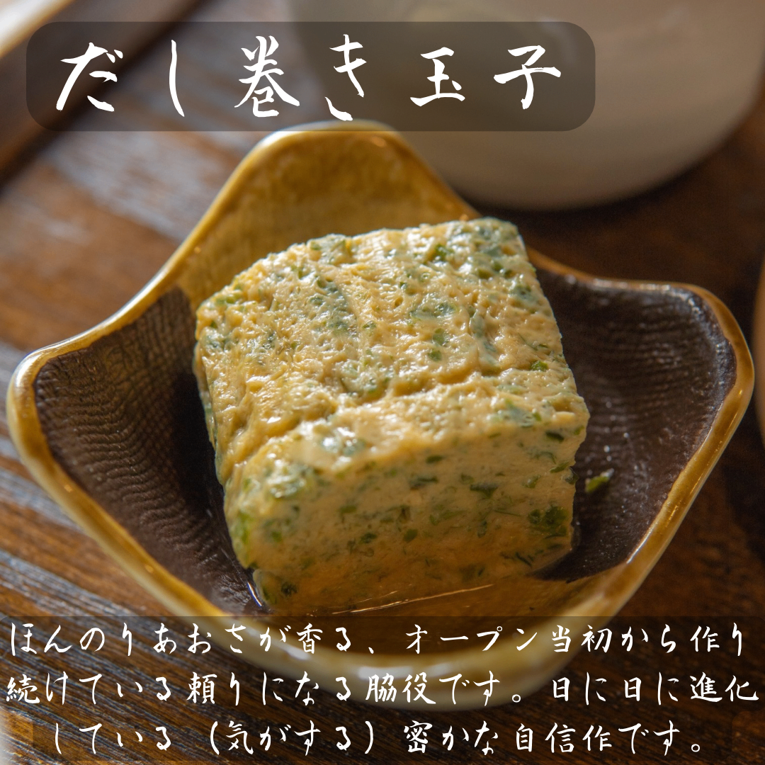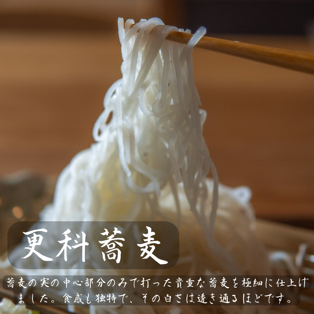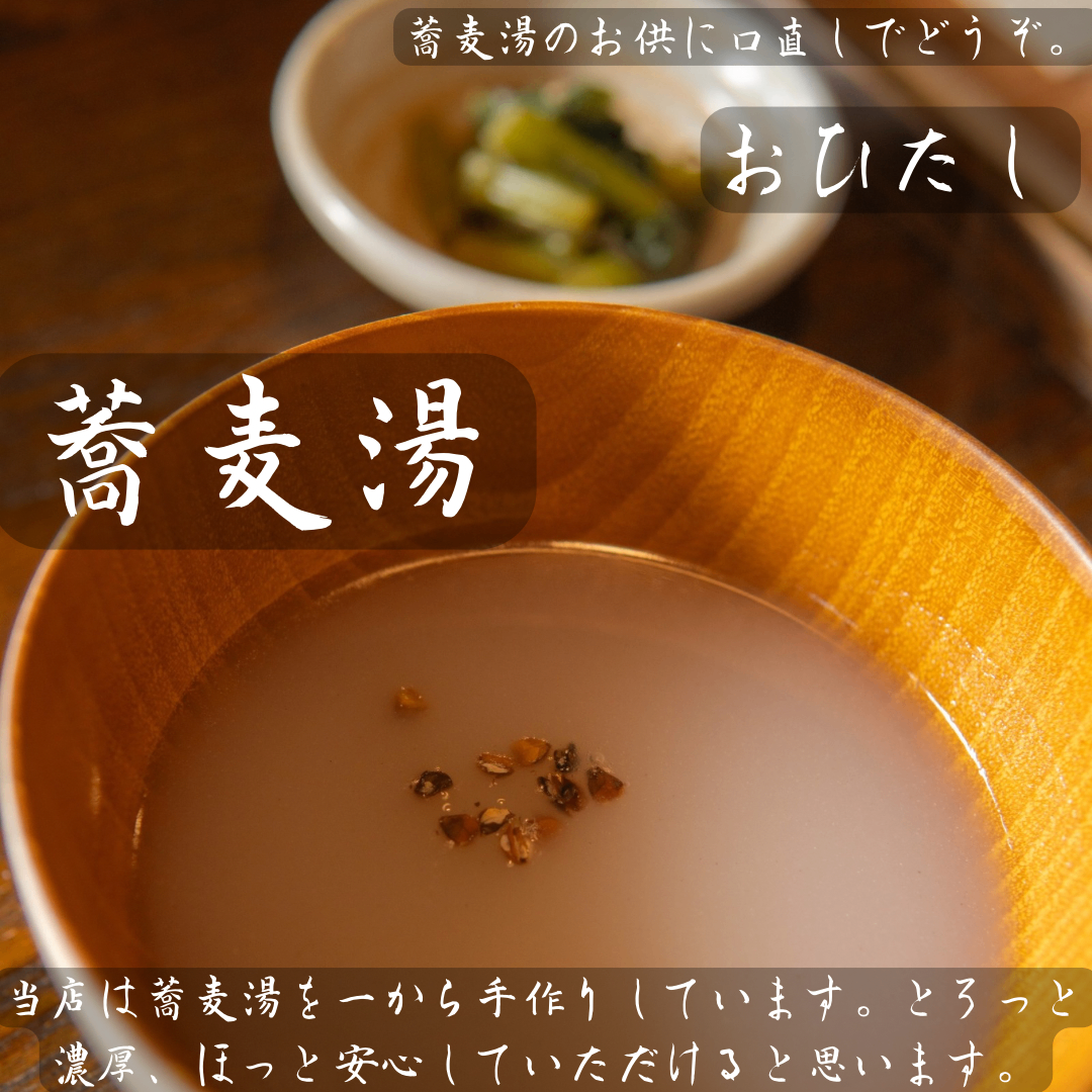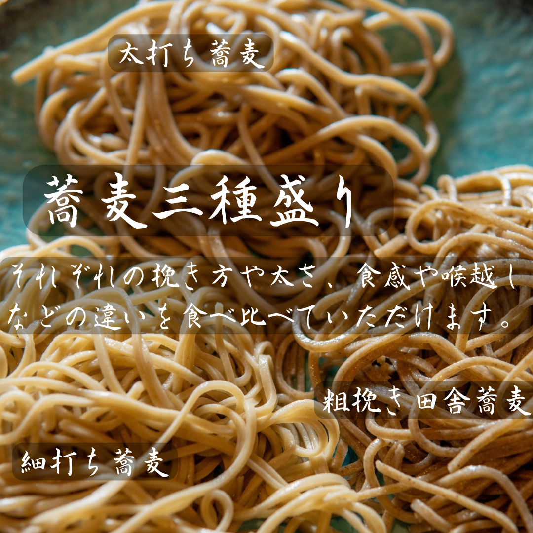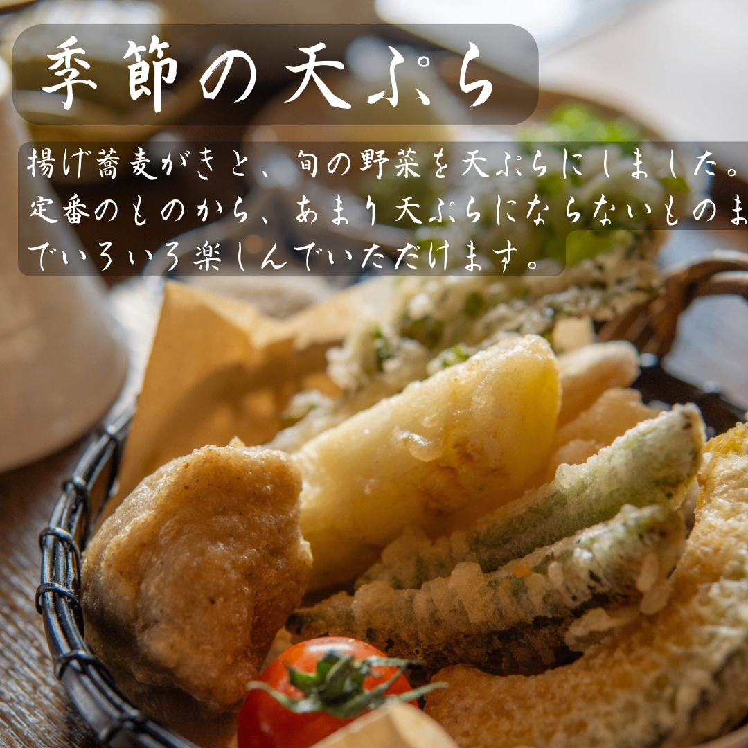 おしながき・蕎麦がき ・だし巻き玉子 ・季節の天ぷら ・更科蕎麦 ・蕎麦三種盛り ・手作り蕎麦湯、小鉢 ・蕎麦のデザート
