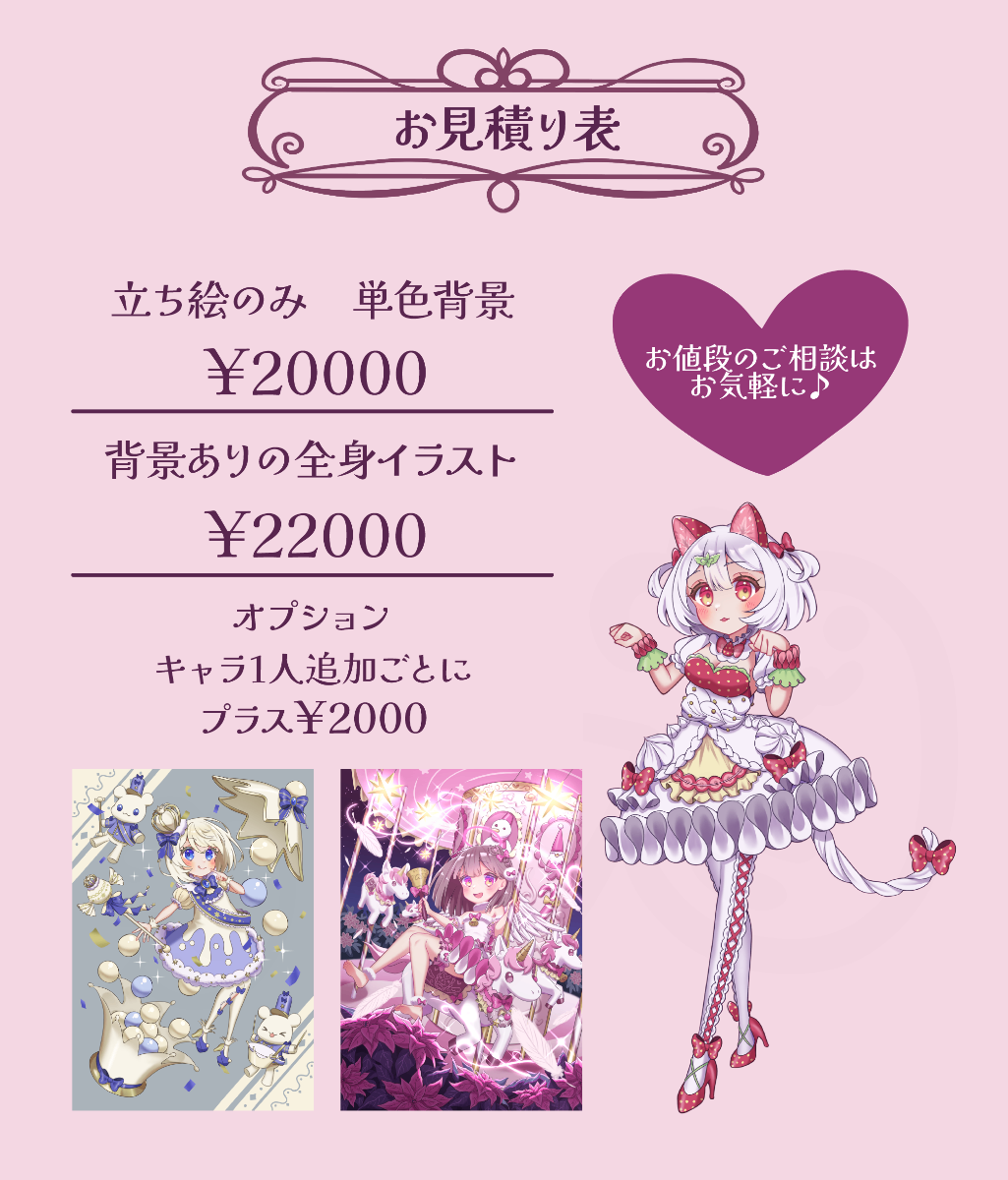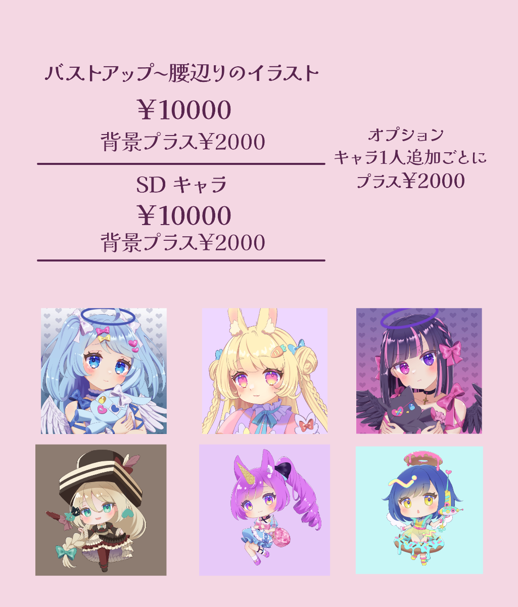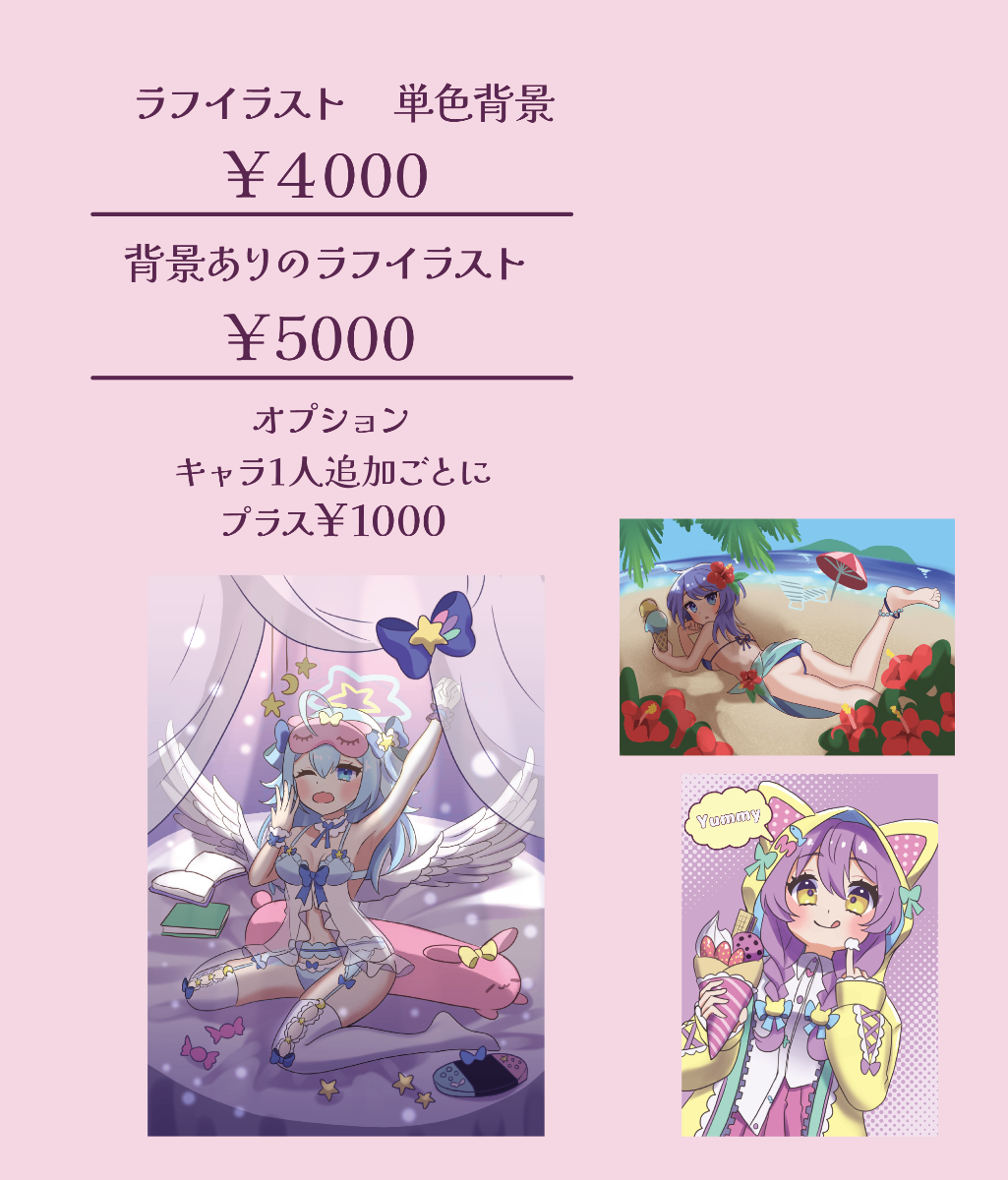 ご依頼のさいは必ず一読して下さい不可なもの・夢絵、夢主・成人向け表現、グロ、流血表現、暴力的表現・極端に布面積が少なく、胸部や下半身を極端に強調・重視しているキャラクター(普通の水着などはOK)1、メッセージにてご依頼内容、お見積りのご相談。2、製作開始。3、構図案の提示。(カラーラフ)※細かな加筆修正可能なのはここまで※修正可能回数は5回まで。4 、線画と下塗り。(提示がご希望でしたらお申し付け下さい。)5 、仕上げまで塗り込み。6 、納品。※完成後のお客様のご都合での修正、リテイク(色味や表情ポーズを変えたいなど)はお受けしておりません。※注意事項※✕未成年者様のご購入はトラブル防止のためご遠慮いただいております。×著作権は破棄しておりません。×自作発言、原型を留めない改変、切り抜きは禁止しております。×宗教関係、政治・思想的内容を含むサイト、法に触れるような内容のサイトへの使用はご遠慮ください。◯商用利用の判断について以下のご使用は商用利用になります。・IRIAM→立ち絵使用、課金ポイント返礼品でのご利用(不特定多数の相手に絵を送る、グッズに使用し配布する等)・収益化しているYouTube(アイコン・ヘッダー、サムネイルも含める)・販売予定のある同人誌へのご利用※ご不安・ご不明な場合はご相談ください。○トリミング、フィルター加工は用途に合わせてご自由にお使いください。○文字入れは承っておりませんが、必要とあれば納品後ご自由にいれてください。◎クレジット表記/「スミ(@suumin16)」(商用利用の場合は必須とさせていただき、X(旧Twitter)のIDまで表記をお願いします。個人利用の際は任意ですがしていただけるととても嬉しいです)※ご依頼頂いたイラストはSNSやポートフォリオなどに掲載する場合がございます。基本的に掲載はご了承の上ご相談いただけますと幸いです。ご相談時に記載して頂きたい項目になります。・ご予算・イラストのサイズ・イラストのご使用用途・イラストの詳細(できるだけ詳しく/イメージの参考資料があると助かります)・描写する人物の画像(なるべく縮小されていない大きい画像をお願いいたします/必要であれば外部ストレージをご利用ください)・納品期日・商用の有無※描写内容によってはご期待に添えられないと判断しお見送りさせて頂く場合もございますので、詳細をご相談の時点でお聞かせいただければ幸いです。