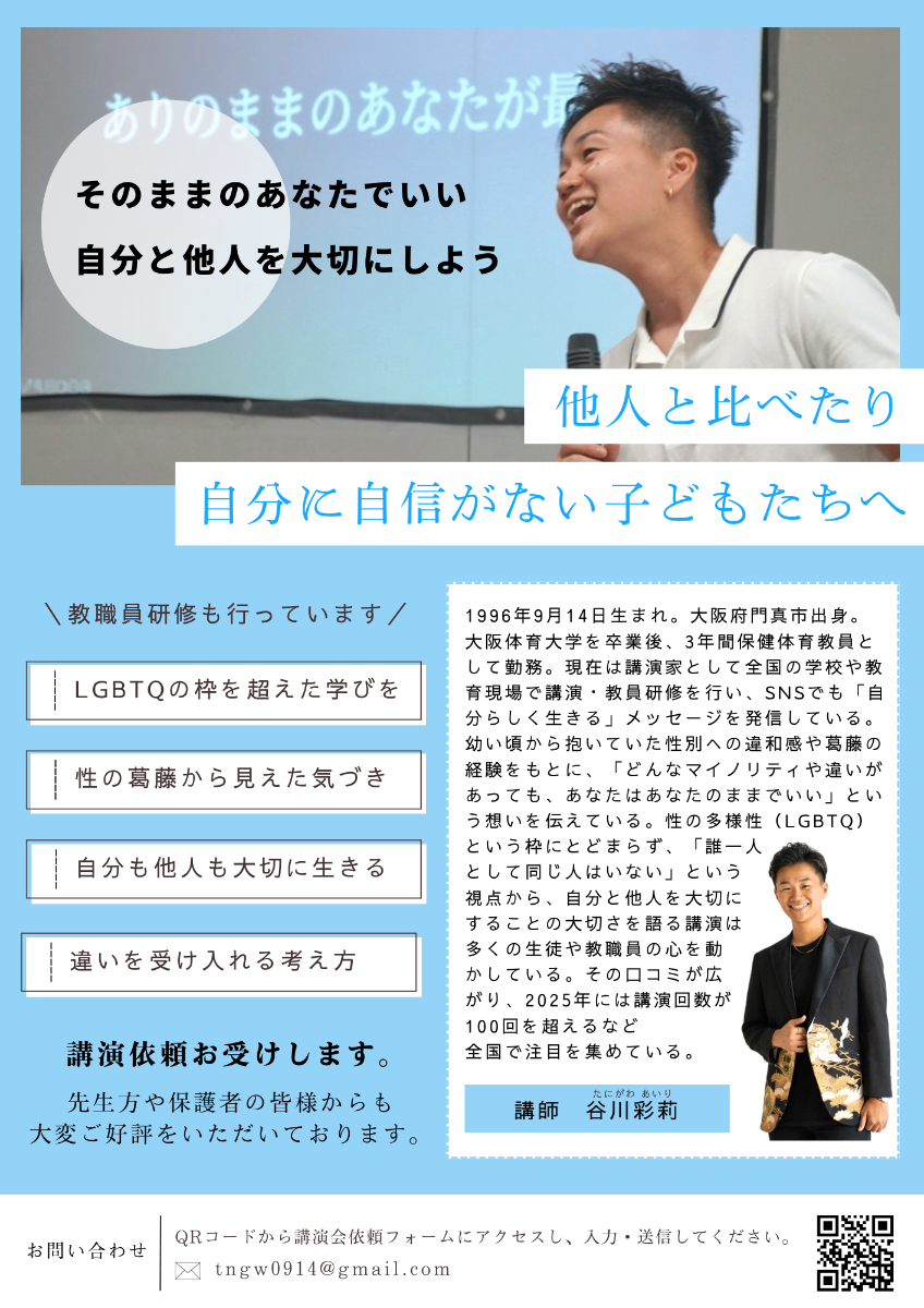 【大阪府】大阪市立今津小学校/大阪市立夕陽丘中学校/大阪市立鶴見小学校/大阪市立茨田南小学校/大阪市立酉島小学校/大阪市立緑中学校/大阪市立中道小学校/大阪府立泉北高等支援学校/大阪府立東住吉支援学校/門真市立門真小学校/門真市立速見小学校/門真市立第五中学校/門真市立門真はすはな中学校/門真市立五月田小学校/門真市立東小学校/門真市立第七中学校/門真市立北巣本小学校/門真市立二島小学校/門真市男女平等教育推進委員会/和泉市立和気小学校/和泉市立芦部小学校/和泉市立国府小学校/高槻市立芝谷中学校/高槻市立五領中学校/阪南市立飯の峯中学校/阪南市立朝日小学校/阪南市立鳥取東中学校/阪南市立桃の木台小学校/阪南市立尾崎小学校/泉佐野市立長坂小学校/泉佐野市立末広小学校/岬町立岬中学校/東大阪市立玉川中学校/東大阪市立意岐部東小学校/八尾市立志紀中学校/豊中市立第十八中学校/堺市立浜寺中学校/堺市北区 民間学堂 小さな森の学童/社会福祉法人育徳園/交野市立第一中学校/富田林市立小金台小学校/富田林市立明治池中学校【兵庫県】三田市立松が丘小学校/三田市立高平小学校/三田市立ゆりの木小学校/三田市立富士中学校/三田市立富士小学校/三田市立藍中学校/三田市立長坂中学校/三田市立八景中学校/三田市人権を考える会/三田市「幸せプロジェクト」/三田市ジェンダー平等推進委員会/あかしあ台小学校区地域部会/高丘中学校地区人権教育研究協議会/丹波篠山市立篠山中学校/猪名川町立猪名川小学校【京都府】花園中学高等学校【滋賀県】滋賀学園高等学校【愛知県】名古屋市立城西中学校【石川県】野々市市立御園小学校【東京都】葛飾区立本田小学校【宮城県】宮城県議会/仙台市立長命ヶ丘小学校/仙台市立長命ヶ丘中学校【香川県】高松市立木太小学校/KHJ香川県オリーブの会【福岡県】直方市立下境小学校【岐阜県】北方町立北学園【その他(団体・主催・イベント等)】Community Studio NAVY/Be Yourself.JAPAN/ファミリー整体院Smile/静岡県/広島県/山形県/北海道/沖縄県