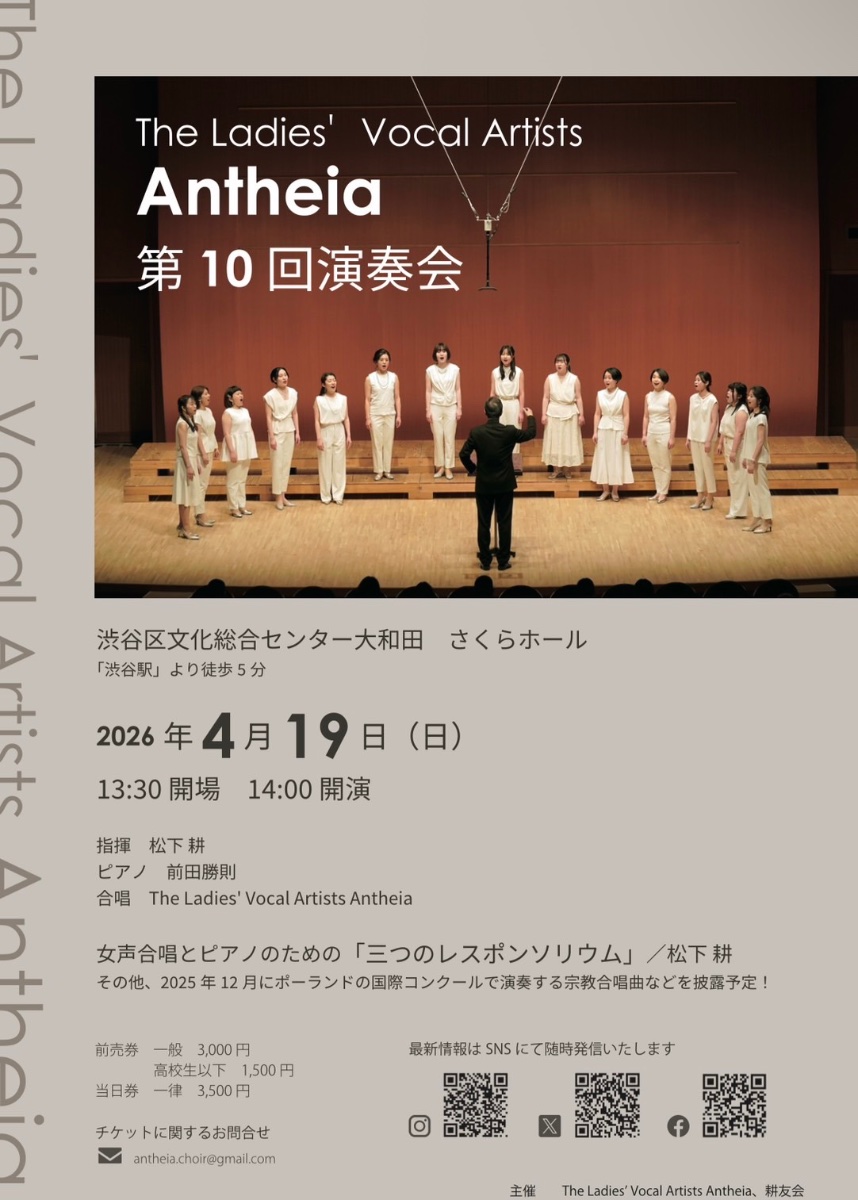 20代〜30代中心の女声合唱団です。団員募集中!! 練習日:水曜夜+日曜朝(月3回) @東京都内 音楽監督・常任指揮者:松下 耕
