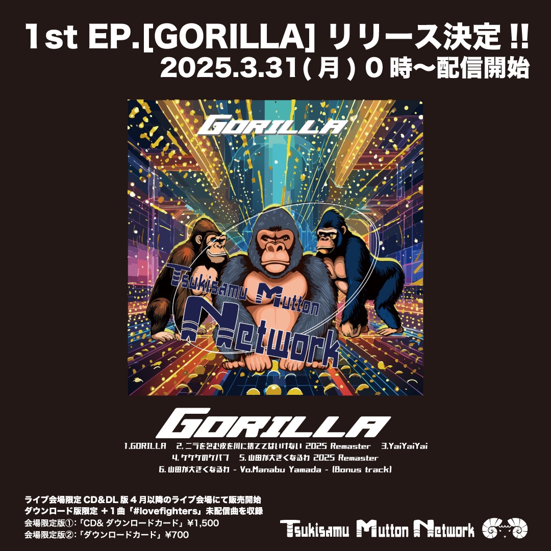 ▶︎2025.3.31 1st EP「GORILLA」0時より配信&会場限定CD&DLカード発売決定! ▶︎2025.3.10 ライブ情報更新!