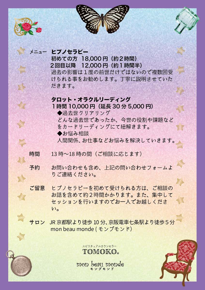 スピリチュアルカウンセリング。ヒプノセラピー、カードリーディング。mon.beau.monde_kyoto