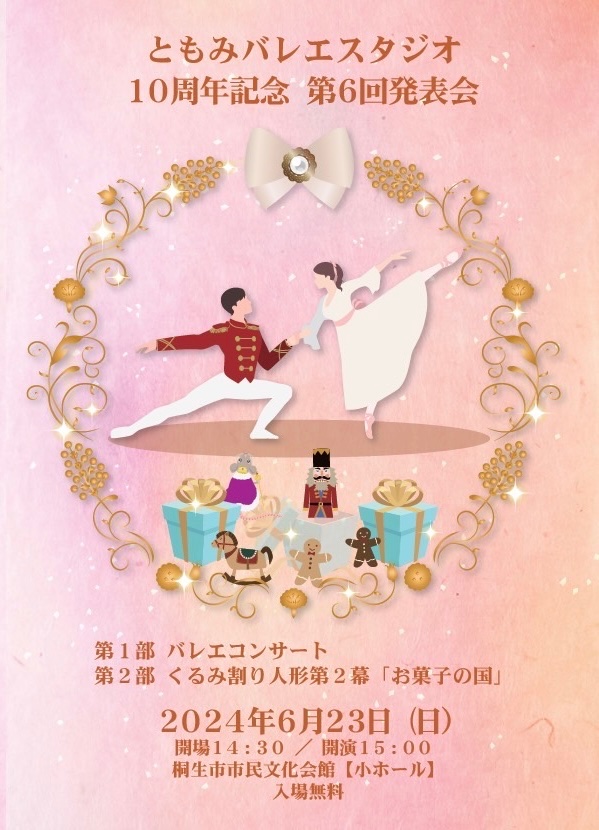 場所 桐生市市民文化会館地下一階ダンス練習室⭐︎令和7年4月より新スケジュール⭐︎*午後1時30分から2時15分(45分)幼児科クラス/年少から年長(バレエ未経験の小学一年生)5,000円*午後1時30分から2時30分(60分)初等科Aクラス/小学1年生から小学3年生6,000円*午後2時40分から4時(80分)初等科Bクラス/小学4年生から6年生7,000円*午後2時40分から4時30分(110分)中高等科クラス/中学、高校、大学生8,000円★各クラス教師の判断により進級します。トゥシューズも教師の判断により許可します。※基本月4回ですが、月により3回もあります。(日程は1ヶ月前にお知らせします)⭐︎入会金3,000円。※発表会は原則必須になります。※地下一階のダンス練習室以外のリハーサル室2や練習室2の場合もあり、日程と一緒にお知らせします)※基礎から丁寧に、わかりやすく教えます。ヨガマットでの柔軟体操や、筋力トレーニングもしています。体幹が鍛えられ、筋力がつきバランスが良くなります。※教師は保育士、幼稚園教諭免許有、保育士の先生として経験15年以上、安心してお子様を、お預けください。たくさん良いところを褒め、自信がつくように導いていきます。舞台で自分発揮できるようになります!こどもの可能性は無限大です♡第6回発表会