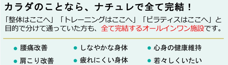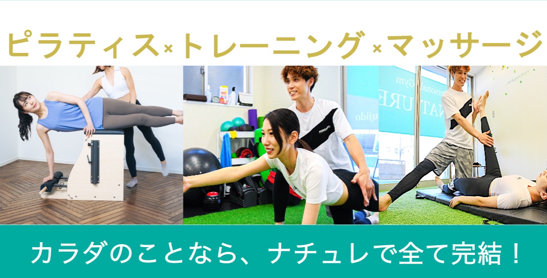 「ピラティス×トレーニング×マッサージ」まで受けられるのはナチュレだけです。リーズナブルな価格で充実の内容をぜひご体感ください!