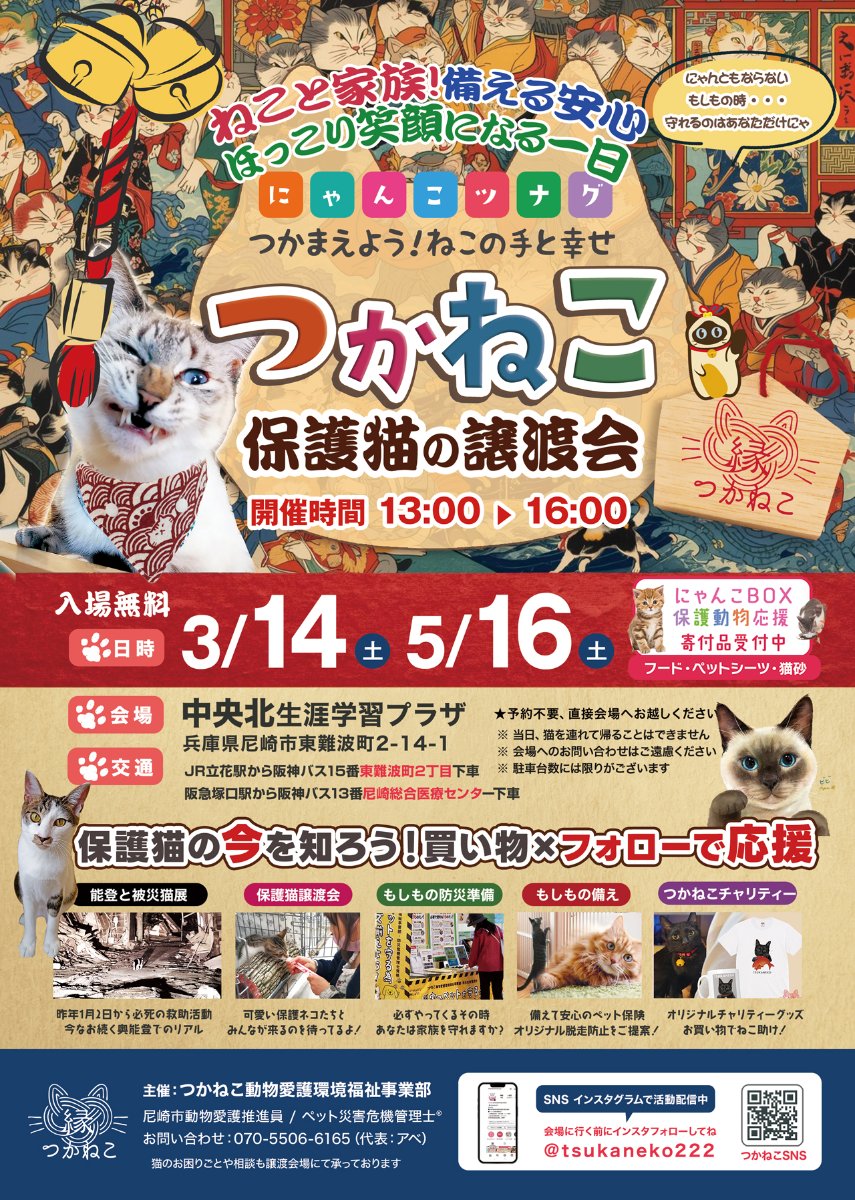 ◆尼崎市動物愛護管理推進協議会委員 ◆ペット災害危機管理士 ・保護猫譲渡会・TNR活動・ペット捜索 ・被災地支援物資配布・啓発パネル展 ⚠️1/2より能登半島地震被災地救助活動~ 📦Amazonほしいものリスト受付中! Instagram https://www.instagram.com/tsukaneko222 リンク ◆ご寄付のご案内 lit.link/tsukaneko ◆インスタグラム instagram.com/tsukaneko222 ◆Amazonほしいものリスト amazon.jp/hz/wishlist/ls/1TMVEZL52ITCK?ref_=wl_share